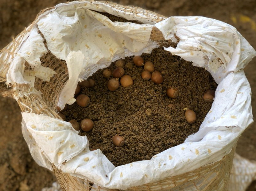 - 자연 분해 되는 황마씨 마대에 흙과 도토리, 가래 등 씨앗을 넣고 종자낭을 만듭니다.