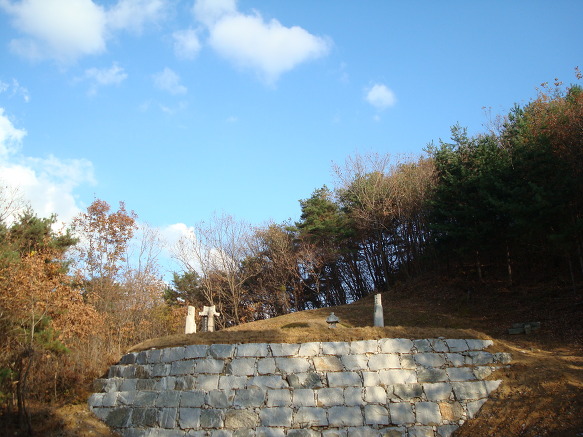 명봉산 정상에서 문막 건등산 정상이 한눈에 들어오는 기슭에 마련된 유택은 언듯 보아 물길이 쏠리는 계곡 끝자락 인듯 싶어 의아해 지기도 하지만