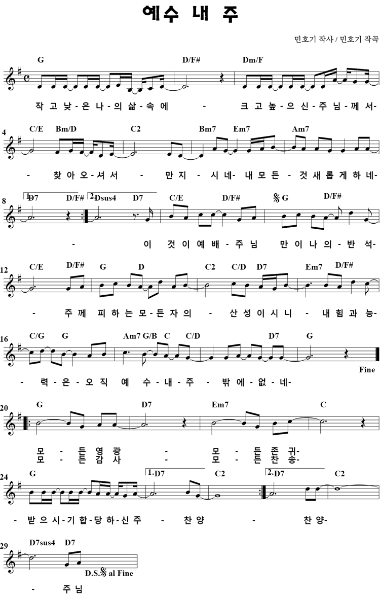 [스크랩] 예수 내 주 / 찬미워십 작성자여호수아|작성시간11.07.03|조회수47 목록 댓글 0 글자크기 작게가 글자크기 크게가 예수 내 주 / 찬미워십 그림악보==▶http://ywg.pe.kr/악보/그림/ㅇ/예수내주1.gif 그림악보==▶http://ywg.pe.kr/악보/그림/ㅇ/예수내주1.jpg 그림악보==▶http://cfile246.uf.daum.net/image/204FE03E4DA187B816958E 그림악보==▶http://cfile260.uf.daum.net/image/1448693E4DA187B92846D0 작고 낮은 나의 삶 속에 크고 높으신 주님께서 찾아오셔서 만지시네 내 모든 것 새롭게 하네 작고 낮은 나의 삶 속에 크고 높으신 주님께서 찾아오셔서 만지시네 내 모든 것 새롭게 하네 이것이 예배 주님만이 나의 반석 주께 피하는 모든 자의 산성이시니 내 힘과 능력은 오직 예수 내 주 밖에 없네 모든 영광 모든 존귀 받으시기 합당하신 주 찬양 모든 감사 모든 찬송 받으시기 합당하신 주 찬양 다음검색 스크랩 원문 : OneJesus 현재 게시글 추가 기능 열기 북마크 공유하기 신고 센터로 신고 댓글 댓글 0 댓글쓰기 답글쓰기 댓글 리스트