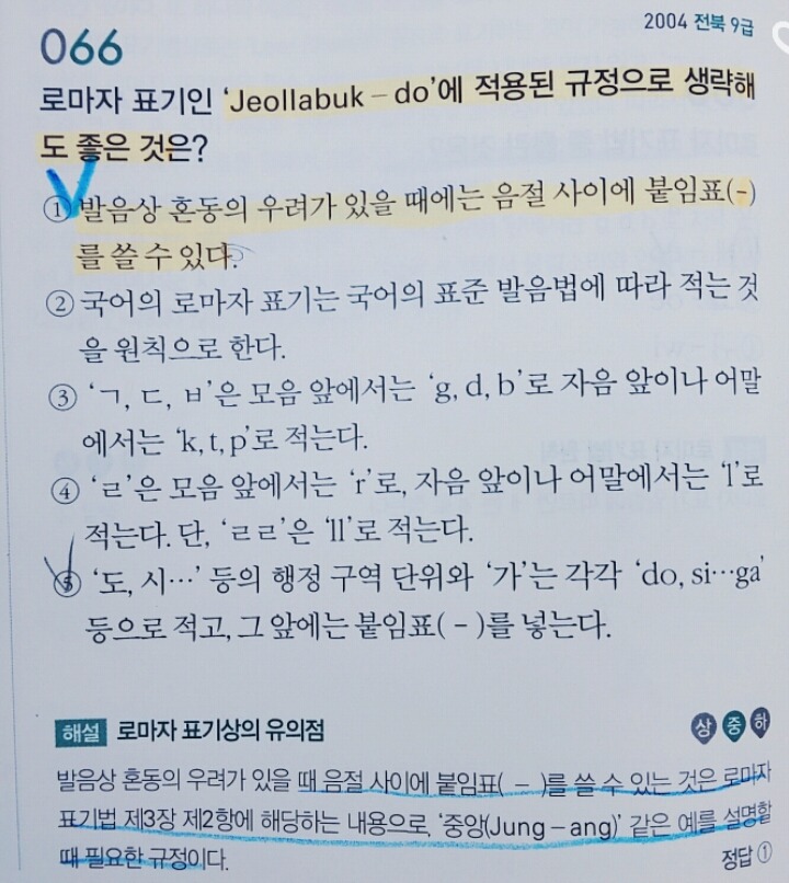 질문1. 이 문제의 전라북-도의 로마자 표기에서 왜 정답이 1번이 되는지 모르겠어요! -도는 행정구역이기 때문에 붙는 붙임표이지 발음상 혼동될까봐 붙이는 게 아니지 않나요?