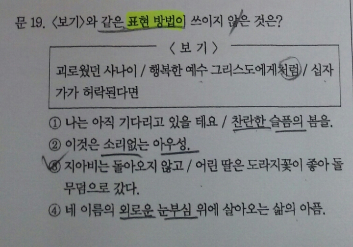 선택지를 역으로 소거해서 풀긴했는데, 보기에 쓰인 표현방법을 바로 찾아내지 못했어요.