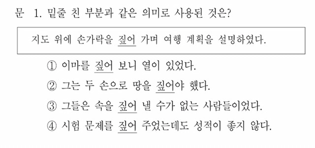 보기 문장의 ‘짚다’는 필수성분으로 (지도 위에) ‘손가락’을 목적어로 취하잖아요? 또한 ‘손가락’의 성분이 ‘관념’이 아니고요! 그럼 선지 1,2,4번이 보기와 조건이 같아 보이는데...이럴땐 의미로 접근해야 하나요? 아니면 제가 구조를 잘 못 분석한 건가요?