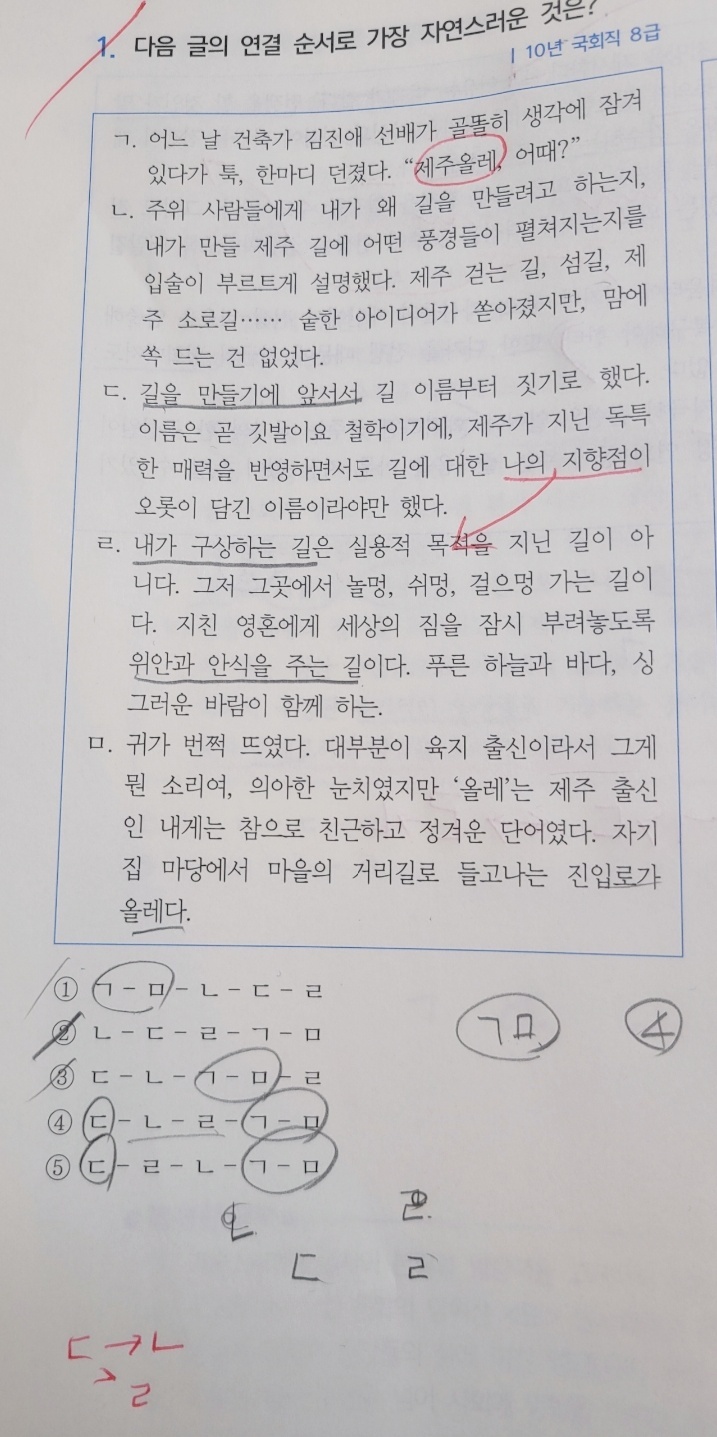 ㄷ. 길 이름 짓기: 나의 지향점이 담긴 이름 -> ㄴ. 사람들에게 설명과 아이디어를 받았지만 마음에 안 듦 -> ㄹ. 아이디어가 마음에 들지 않는 이유: 내가 구상하는 길은 실용적 목적이 아니라 위안을 주는 길이라서.