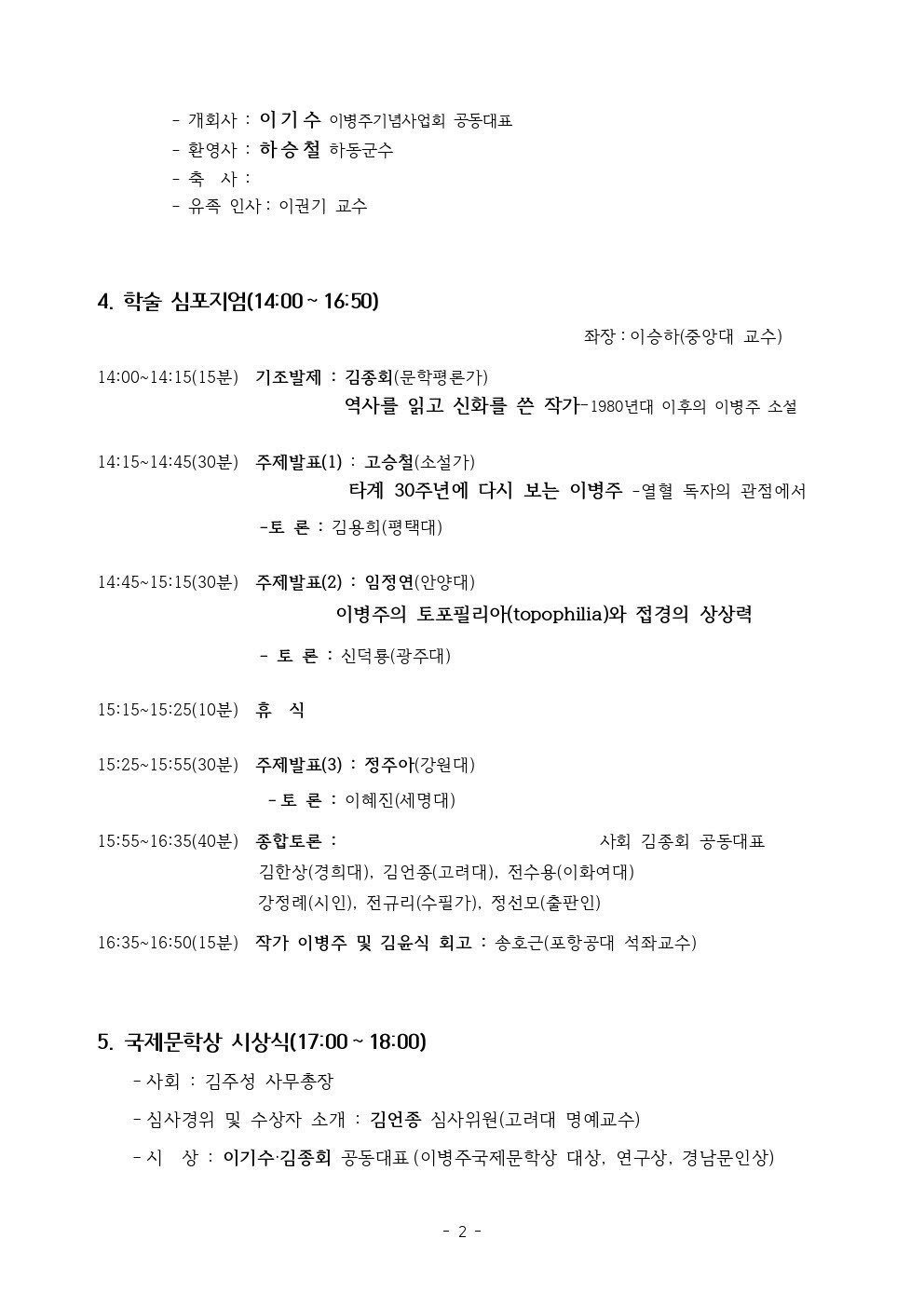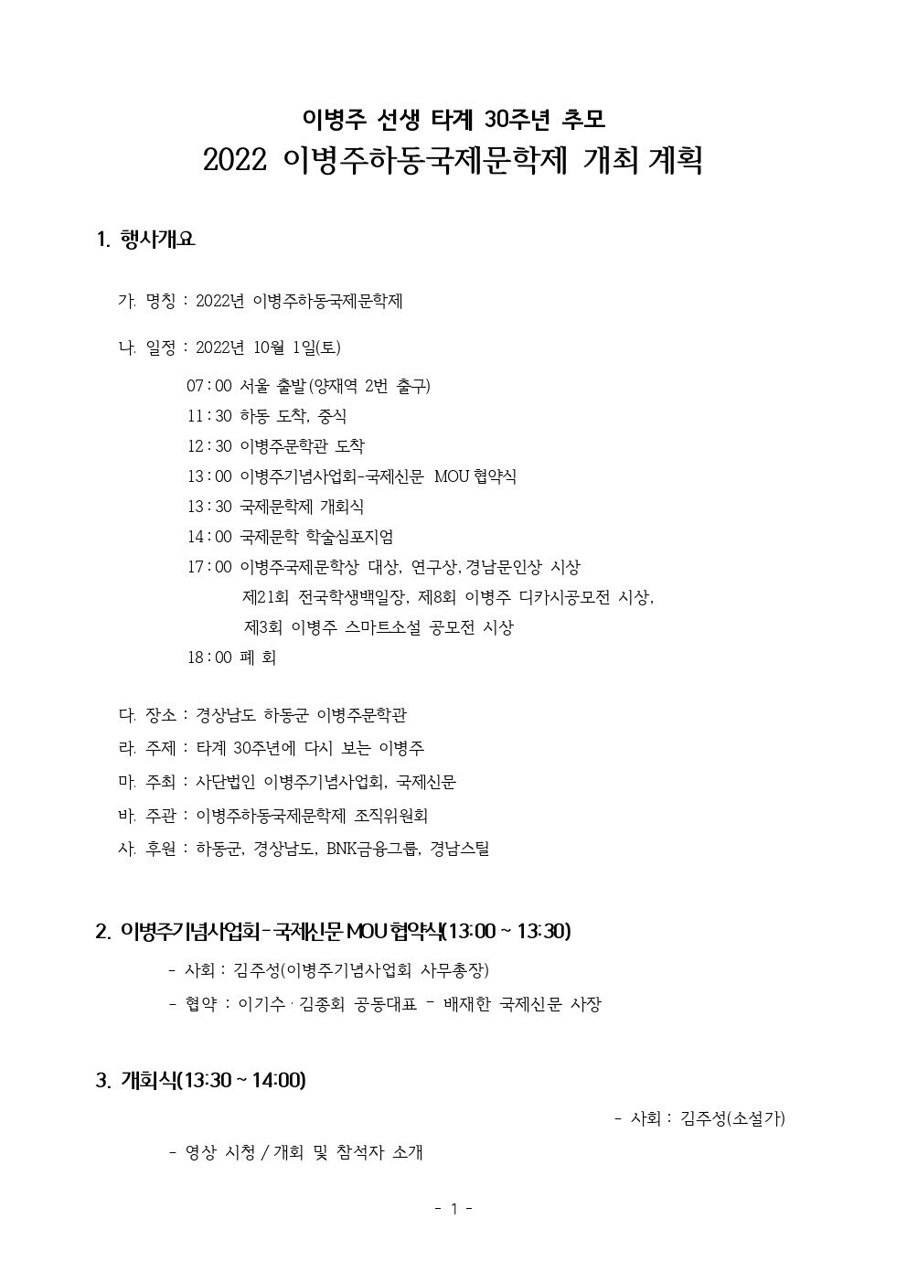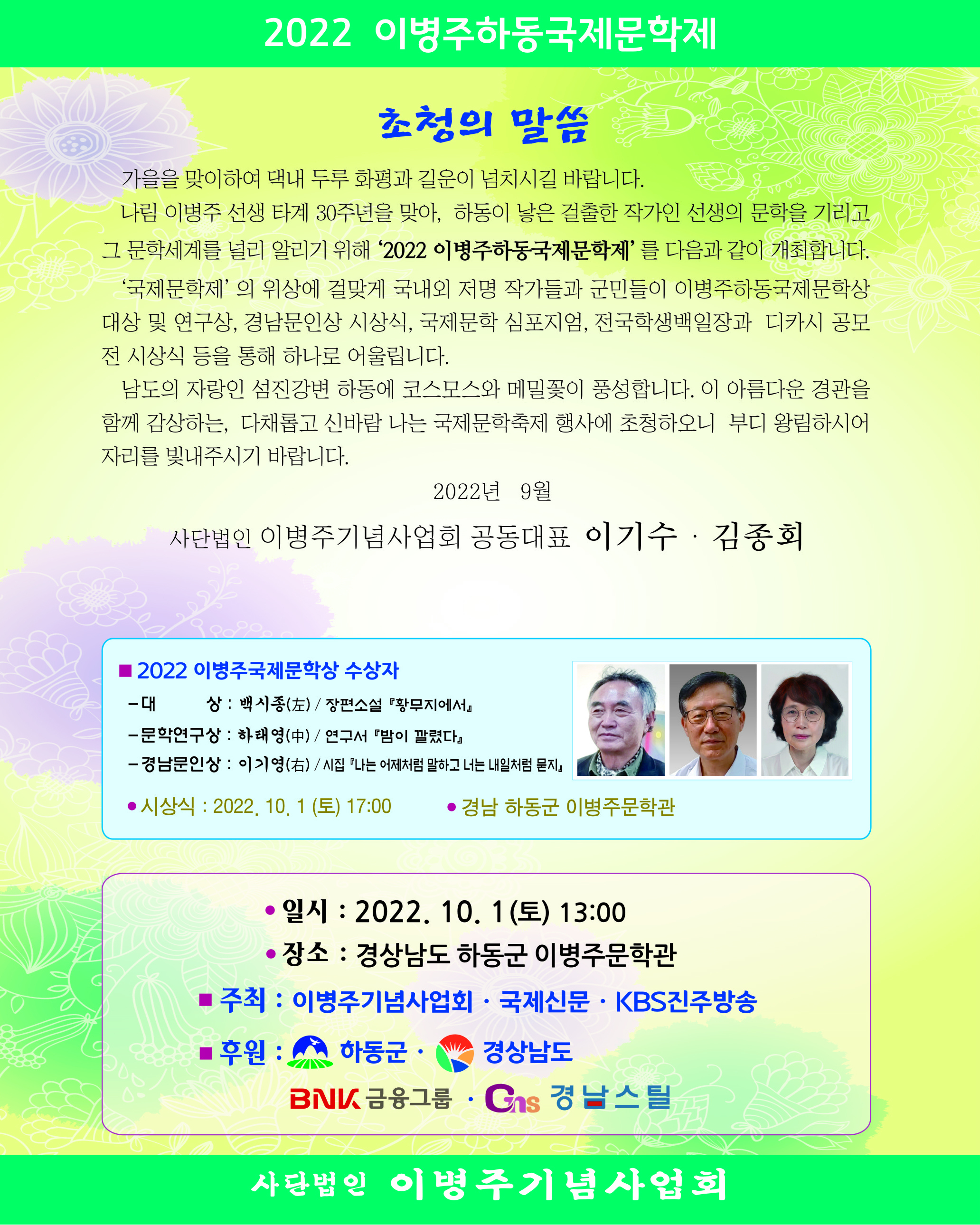 2022년 이병주하동국제문학제 개회 안내 작성자진효정|작성시간22.09.26|조회수252 목록 댓글 0 글자크기 작게가 글자크기 크게가 다음검색 현재 게시글 추가 기능 열기 북마크 공유하기 신고 센터로 신고 댓글 댓글 0 댓글쓰기 답글쓰기 댓글 리스트