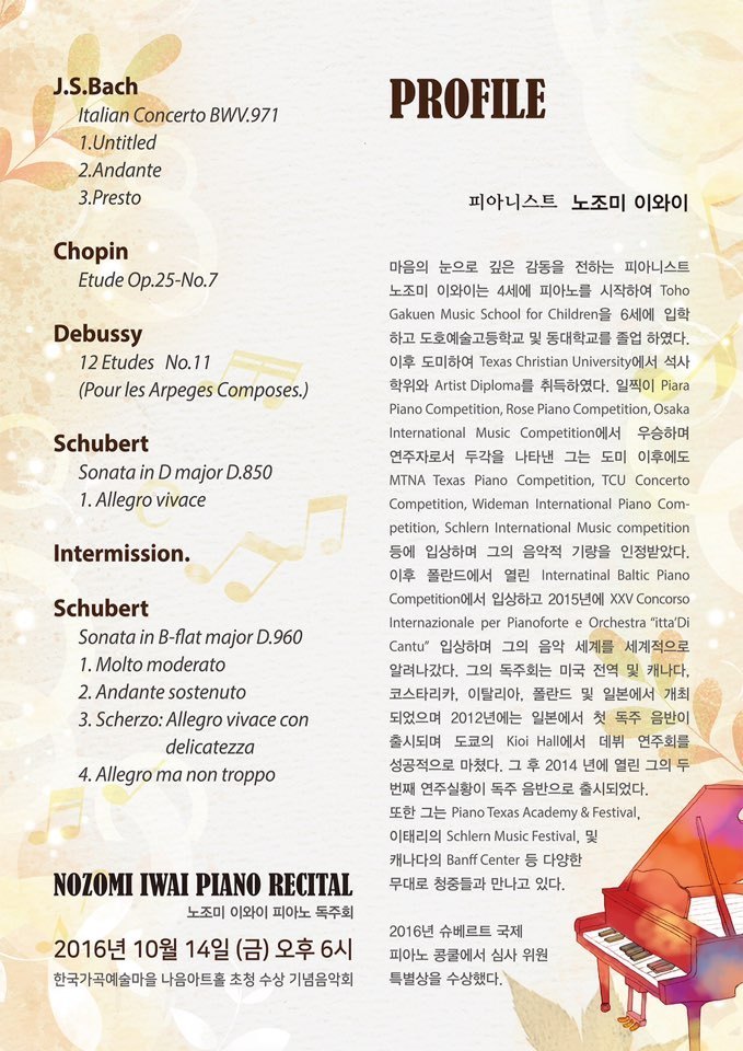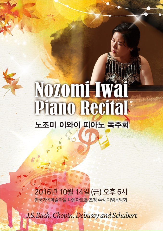 노조미 이와이 피아노 독주회 2016년 10월 14일 (금) 오후 6시 한국가곡예술마을 나음아트홀 초청 수상 기념음악회