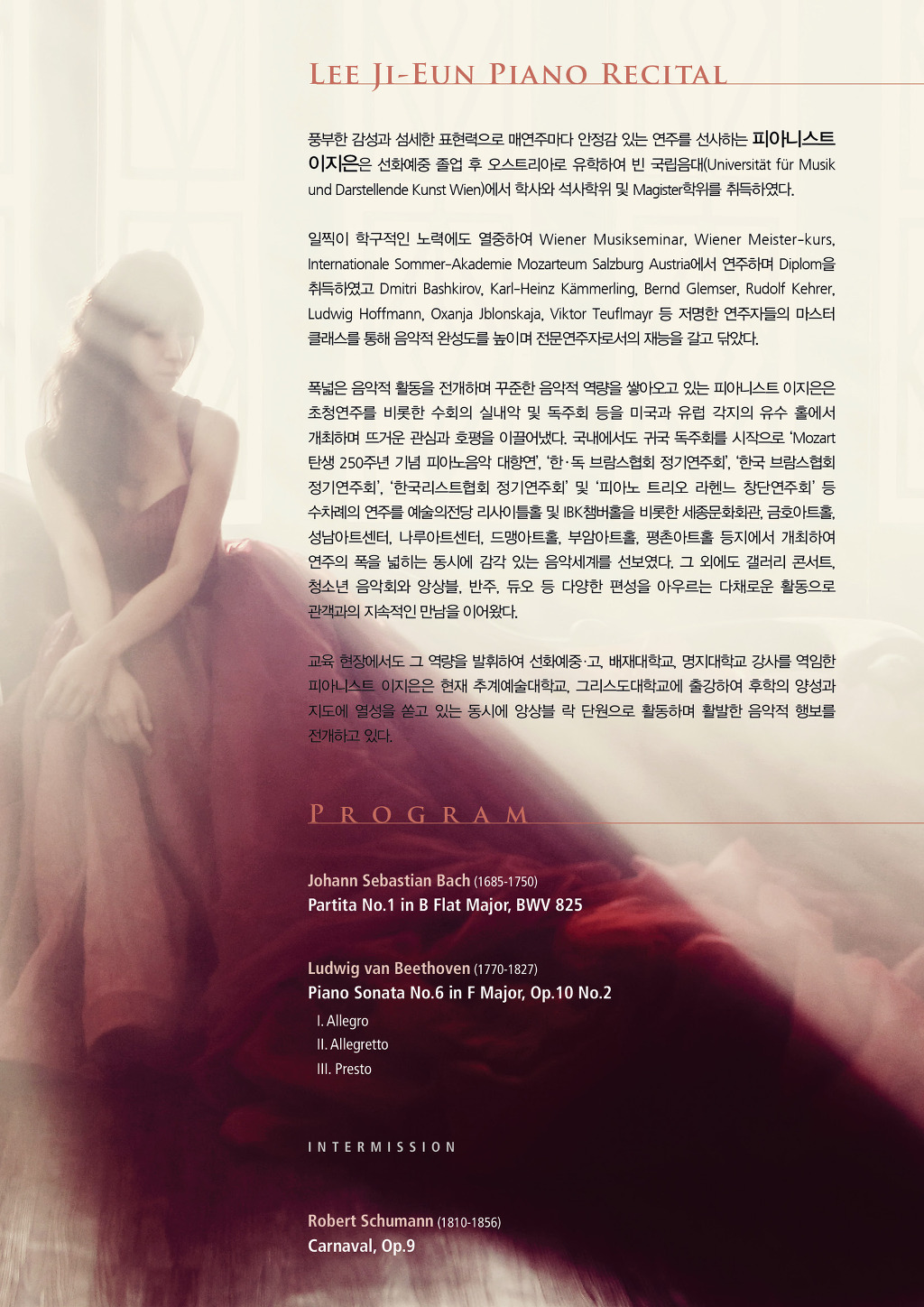 풍부한 감성과 섬세한 표현력으로 매연주마다 안정감 있는 연주를 선사하는 피아니스트 이지은은 선화예중 졸업 후 오스트리아로 유학하여 빈 국립음대(Universitaet für Musik und Darstellende Kunst Wien)에서 학사와 석사학위 및 Magister학위를 취득하였다.