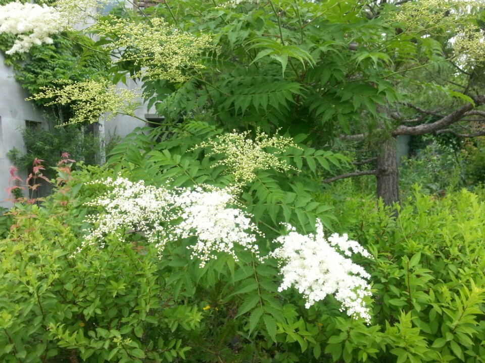 장미과에 속한 낙엽 활엽 관목. 키가 5~6m 정도이며 뿌리는 땅속줄기처럼 옆으로 뻗고, 잎은 어긋나며 잔잎 13~23장이 깃털 모양의 겹잎으로 달린다. 잔잎의 표면에는 털이 없으나 뒷면에는 별 모양의 털이 있다. 흰색의 작은 꽃은 6~7월에 가지 끝에서 원추꽃차례로 핀다.