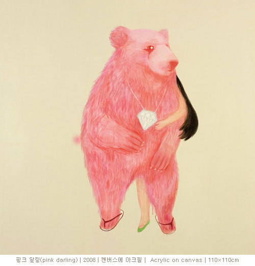 | “나의 작업은‘내가 가장 예뻤을 때’의 순간의 기억과 상상을 통한 그림일기이다. 나는 소녀의 시각에서 세상을 바라보고 두리번두리번 주위의 이야기를 살살 건드려 보기도 하고 가끔은 꾸-욱 찔러 보기도 한다. 예쁘게 살고 싶지만, 하나같이 트라우마를 가지고 있는 이 잔인한 세상을 살아가는 소녀들. 예쁘게 보이고 예쁘게 살고 싶어서, 예쁜 색으로 그림을 그린다. 그런데 가만히 들여다보면 가장 예뻤을 때에 주인공 들은 하나같이 소외되고 우울하며 예쁘지 않다. 예뻐 보이지만 예쁘지만은 않은……. 그렇지만 예쁘게 예쁘게…….” - 작가의 생각 | ||