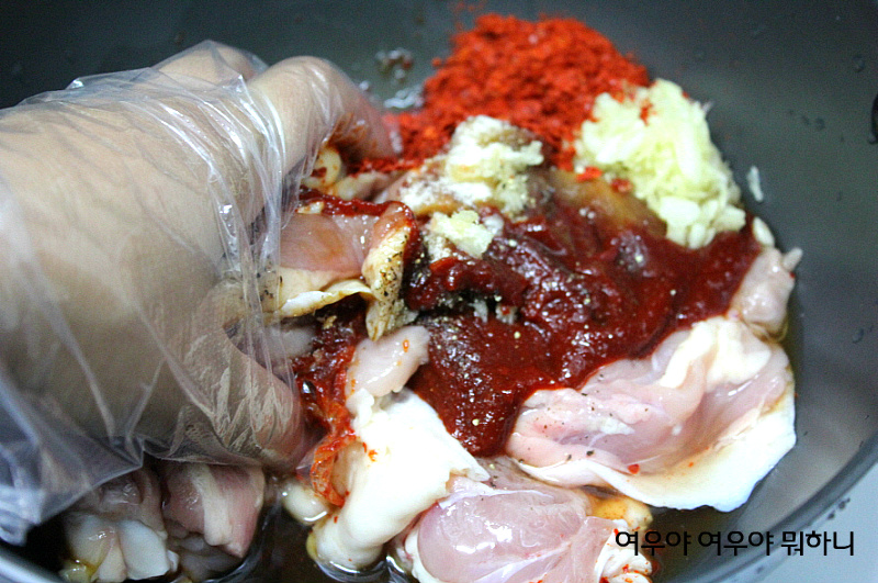 흐르는 물에 씻은 닭다리살에 갖은 양념을 넣고 조물조물 버무린후