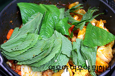 고구마랑 고기가 완전히 익으면 깻잎을 넣고 잘 섞으며 구워주세요
