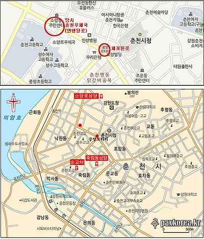 6.25 때 순교한 고 안토니오 신부의 살신성인 기념 성당 ![]() 소양로 성당은 1949년 1월 죽림동 본당으로부터 분리·설립되었으며, 초대 주임으로 성 골롬반 외방선교회 소속의 고 안토니오(Anthony Collier, 1913.6.20.∼1950.6.27) 신부가 부임하였다. 그러나 이듬해 한국 전쟁이 발발하자 콜리어 신부는 교구장 퀸란(T. Quinlan, 具仁蘭) 몬시뇰의 만류에도 불구하고 끝까지 본당에 남아 신자들을 돌보고 부상자들을 치료하다가 복사 김경호 가브리엘과 함께 생포되어 6월 27일 인민군에 의해 사살되고 말았다. 이로써 콜리어 신부는 성 골롬반 외방선교회 소속 선교사 가운데 한국 전쟁의 첫 희생자가 되었다. ![]() 전쟁이 일어나던 6월 25일은 주일이었고, 고 신부는 본당에서 주일 미사를 봉헌하고, 교우들과 저녁 기도를 바치고, 그 곳에 머물렀다. 적군이 코앞에 와 있었지만 고 신부는 6월 26일에도 미사를 봉헌했고, 위험한 상황에 대비하기 위하여 우선 성체를 옮겨 놓았다. 폭격이 심해지자 방공호로 대피한 후, 고 신부는 함께 있던 복사와 신자들을 안전하게 피신하도록 권고하고, 자신은 성당을 지키겠다고 말하였다. 전황이 나빠지자 6월 27일 오후 고 신부는 복사였던 김경호 가브리엘과 함께 죽림동 성당으로 가던 중 우체국 근처 로터리 부근에서 인민군의 검문을 받았다. ![]() 인민군이 고 신부에게 스파이냐고 묻자 고 신부는 가톨릭 신부라고 당당하게 대답하였고, 둘은그 자리에서 체포되었다. 인민군 장교는 신부의 주머니를 수색하여 시계, 묵주, 돈과 개인 소지품을 다 가져갔다. 그리고 두 사람은 즉시 밧줄에 묶여 소양강변 부근(또는 공지천 방향)으로 끌려갔는데, 도중에 인민군은 고 신부를 먼저 쏘고 다시 두 발을 더 쏘았다. 총을 맞고 고 신부는 그 자리에서 선종하였다. 김 가브리엘은 고 신부가 총을 맞으면서 그를 끌어안았기 때문에 목과 어깨에 심한 총상만 입고 살아났다. 김 가브리엘과 밧줄에 묶여 끌려가던 콜리어 신부는 “가브리엘, 자네는 처자식이 있으니 꼭 살아야 하네. 저들이 총을 쏘기 시작하면 재빨리 쓰러지게. 내가 쓰러지면서 자네를 덮치겠네.”라고 말했다. 예상대로 인민군 병사는 경고 한 마디 없이 총을 난사했다. 그때 김 가브리엘은 목과 어깨에 총상을 입었지만 자신을 끌어안고 쓰러진 콜리어 신부 덕분에 목숨을 건져 훗날 그 상황을 생생히 증언했다. 1950년 6월 27일에 순교한 고 신부의 시신은 6월 29일 교우와 동네 사람들이 총살당한 그 자리에 묻었다. ![]() 현재 소양로 성당 건물은 3대 주임신부인 성 콜롬반 외방선교회 제임스 버클리(James Buckley) 신부가 순교한 콜리어(Anthony Collier) 신부를 기리고자 1956년 건립한 성당이다. 국내 최초로 근대적 양식을 도입한 교회 건축물인 이 성당의 평면은 당시에는 보기 드문 반원형을 기본으로 하여 중앙 제단을 중심으로 신자석을 부채꼴로 배열하고, 원주면 중앙에 현관과 고해소, 좌우 끝단에 제의실과 유아실을 덧붙인 형태이다. 아치창, 버팀벽 등은 교회 건축에서 흔히 쓰는 고전적 기법이지만 일체의 장식을 배제한 단순한 형태와 밝고 기능적인 내부 공간은 근대적인 건축 개념을 적용한 것으로 중세풍의 양식적 교회 건축에서 벗어난 선진적 형태로 평가받고 있다. 2005년 4월 15일 문화재청으로부터 근대문화유산 등록문화재 제161호로 지정되었다. 그 후 소양로 성당은 2006년부터 원형 보존작업을 통해 말끔하게 단장하고 원형을 최대한 살려 2009년 5월 중창(重創) 축복식을 가졌다. 또한 춘천교구는 양떼를 지키기 위해 목숨을 내놓은 콜리어 신부의 순교혼을 기억하고자 소양로 성당을 살신성인 기념성당으로 명명하였다. ■ 고 안토니오 신부의 순교터 고 안토니오 신부의 순교에 대해서는 몇 가지 자료를 통하여 그 정황을 알 수 있다. 그러나 이 자료들은 체포와 총살당한 시간과 장소 등 멎 가지 사실에 대하여서로 다르게 말하고 있다. 「소양로 본당사 1950-2012」를 참고하여 정리하였다. 고 신부의 순교에 관한 자료로는 김경호 가브리엘 증언 <골롬반 문서>8-17~20. 춘천-52, 「HOW FATHER COLLIER DIED」 「Articles on Korea in the Irish Far East Volume 2 1933-1952」. 「Fifty Years of Columban Outreach to the Korean People」, 「The Splendid Cause 1933-1983」, <소양로 1950-1960> (남 미카엘 신부 보고서), 그리고 김경호 가족들의 증언 등이 있다. 1. 김경호 가족들의 증언 여동생인 김영자 수산나(1937년 생), 김순자 세실리아 자매가 2011년 4월 5일 소양로 성당 사제관에서 소양로 성당 김주영 시몬 신부 및 관계자들과 행한 인터뷰이다. 「전황이 나빠지자 6월 27일 오후 고 신부는 복사였던 김경호 가브리엘과 함께 죽림동 성당으로 가던 중 우체국 근처 로터리 부근에서 인민군의 검문을 받았다. 인민군이 고 신부에게 스파이냐고 묻자 고 신부는 가톨릭 신부라고 당당하게 대답하였고, 둘은 그 자리에서 체포되었다. 두 사람이 체포된 시간은 14시 15분경이다. 인민군 장교는 신부의 주머니를 수색하여 시계, 묵주, 돈과 개인 소지품을 다 가져갔다. 그리고 두 사람은 즉시 밧줄에 묶여 소양강변 부근으로 끌려갔는데, 인민군은 이들에게 총을 겨누었다. 인민군은 고 신부를 먼저 쏘고 