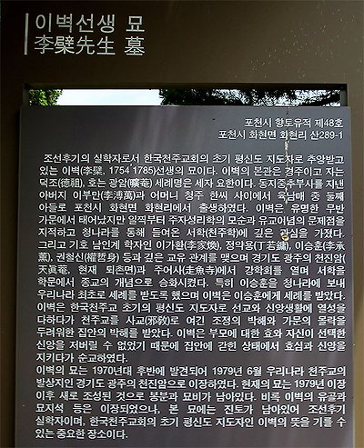 한국 천주교회 창설 주역 중 한 명인 이벽의 묘와 탄생지 ![]() 한국교회 창설 주역 중 한 명인 이벽(세례자 요한, 1754-1785)은 한국 천주교회 최초의 천주교 신자이자 초기 신앙공동체를 구성한 인물이다. 이벽은 이승훈을 베이징에서 세례를 받아오게 했으며, 그 역시 1784년 겨울 자신의 집에서 이승훈으로부터 세례를 받았다. 이것은 조선 최초의 천주교 세례식으로, 이벽의 집은 한국 천주교회 역사상 처음 세례식이 집전된 역사적 장소이다. 이벽은 조선왕조 치하에서 순교한 신앙선조 가운데 제2차 시복추진 대상자인 ‘이벽 요한 세례자와 동료 132위’에 포함되어 시복절차를 밟고 있다. ![]() 한국 천주교의 선구자인 이벽은 경기도 광주에서 출생하였다. 건장한 신체에 무술에도 능했으며, 경서(經書)에 전통하고 언변도 좋아 물 흐르듯 했다고 한다. 아버지 부만은 이벽이 무관으로 출세하길 바랐으나 그는 완강히 거부하였기 때문에 아버지의 미움을 사서 벽(僻)이라는 별명을 얻기도 하였다. ![]() 이벽은 조선 천주교 창설에 선구자적 역할을 하였다. 1777년 이래 주어사, 천진암에서 있었던 수사학(洙泗學)적 분위기의 강학을 그리스도교 진리 탐구와 실천적인 분위기로 바꿨고, 이승훈에게 천주교를 소개하여 중국에 가 영세를 받게 함으로써 1784년 많은 조선인 신자 공동체를 이룩하게 하였다. 한국 천주교가 이 해를 천주교 창설의 원년으로 삼아 기념하고 있음을 미루어 볼 때 이벽의 선구자적 역할은 의심의 여지가 없다. 을사추조적발사건으로 천주교 신자가 있는 가정에서는 자기 집안에 불행을 가지고 올지도 모를 이 종교를 버리게 하기 위해 갖가지 방법을 썼다. 이벽의 아버지도 이벽을 배교시키기 위해 나섰다. 이에 이벽은 자신의 신앙을 감추었고 그 후로는 외부와 모든 연락을 끊은 채 살았다. 그는 가정의 박해속에 살다가 1785년(또는 1786년) 33세를 일기로 요절하였다. ![]() ◆ 이벽의 묘 이장 이벽의 묘와 그 후손들의 흔적을 찾아오던 변기영 신부는 백방으로 꾸준히 노력한 끝에 1979년 2월 15일 마침내 경기 포천시 화현면 화현리 산 289-1 번지 공동묘지 갓등산 낮은봉에서 이벽의 묘를 발견했다. 그리고 동시에 같은 곳에서 이벽 성조의 부친 이부만 옹의 묘와 동생 이석의 묘도 함께 발견됐다. 묘지 아래 동네(화현리 543-1번지)를 생가터로 추정하고 있다. ![]() 그러나 이장이 불가피하고 시급한 처지였으므로 이장 준비위원회를 꾸려 1979년 6월 21일 목요일에 주교들과 많은 신부, 수녀, 평신도들이 모인 가운데 묘를 발굴하니 “통덕랑 경주 이벽지묘”라는 지석이 한가운데서, "공인 안동권씨지묘"와 "공인해주정씨묘"라는 두 부인들의 지석 좌우편에서 나오고 그들의 유해가 완연하게 나왔다. 당일로 이벽 성조의 유해는 혜화동 성당에 안치됐고 다음날 혜화동 성당에서 이벽 성조의 유해를 새 관에 입관하면서 머리 상투와 치아 23개, 우측 두골 등을 취해 냈으며, 그 유해들은 묘지석, 관조들과 함께 새로 건립될 기념관에 모시기로 결정됐다. 그리고 토요일 오후에 이벽 성조의 유해는 주교좌 명동 성당으로 옮겨졌다가 다음 날 즉 24일, 주일이며 동시에 이벽 성조의 영세 본명 축일을 맞아 낮 12시에 그곳 명동 성당에서 한국인 최초의 주교 노기남 대주교와 역시 한국인 최초의 추기경 김수환 추기경의 공동 집전으로 이장 미사를 성대히 거행됐다. 유해는 미사가 끝난 후 즉시 출발해 15일 전부터 구축된 천진암 새 묘지에 1979년 6월 24일 오후 3시 30분에 김남수 주교의 주례로 하관 예절을 마쳤다. ◆ 이벽의 출생지와 순교지의 화현리설 서종태 교수는 강원교회사연구소 주최로 2012년 3월 17일 춘천교구 포천 성당 레오회관에서 개최된 ‘광암(曠庵) 이벽과 포천 지역 천주교’를 주제로 열린 이날 심포지엄에서 “이벽이 속한 경주 이씨 족보에 의하면 포천 화현리에 이벽의 부친인 이부만과 그 후손들의 묘를 비롯해 이부만과 그 후손들이 대대로 살았던 집터가 있는 것으로 확인됐다”며 “이에 따라 포천 화현리는 이부만부터 그의 가계가 대대로 살았던 세거지였음을 알 수 있다”고 말했다. 서 교수는 또 이벽의 탄생지로 광주 두미와 포천 화현리가 거론되고 있는 가운데 “포천 화현리는 이부만부터 그의 증손대까지 4대의 묘가 들어선 선영이 있을 뿐만 아니라 이부만부터 그의 후손들이 대대로 살았던 집터가 있었고, 「이벽젼」에서 이벽의 탄생지를 포천으로 표현하고 있다는 점을 들어 이벽의 탄생지로 생각된다”고 덧붙였다. 서 박사는 이어 "자식을 배교시키기 위해 온갖 노력을 다했던 이벽의 부친은 그를 고향집으로 불러들여 천주교인들과 접촉하지 못하게 막은 것이 분명하다"면서 "이벽이 가정의 박해를 받아 치명한 곳은 객지살이하던 광주 두미나 서울 수표교 인근 집이 아니라 포천 화현리에 있던 고향집으로 이해하는 게 옳다"고 주장했다. ![]() ■ 이벽(李檗, 세례자 요한, 1754 ~ 1785?) 한국 천주교의 선구자인 이벽은 경주 이(李)씨 부만(溥萬)의 둘째 아들로 경기도 광주에서 출생하였다. 호는 광암(曠菴)이다. 건장한 신체에 무술에도 능했으며, 경서(經書)에 전통하고 언변도 좋아 