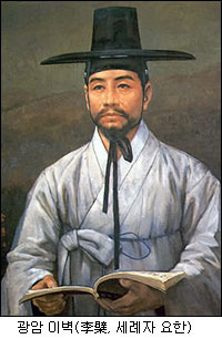 한국 천주교의 선구자인 이벽은 경주 이(李)씨 부만(溥萬)의 둘째 아들로 경기도 광주에서 출생하였다. 호는 광암(曠菴)이다. 건장한 신체에 무술에도 능했으며, 경서(經書)에 전통하고 언변도 좋아 물 흐르듯 했다고 한다. 아버지 부만은 이벽이 무관으로 출세하길 바랐으나 그는 완강히 거부하였기 때문에 아버지의 미움을 사서 벽(僻)이라는 별명을 얻기도 하였다.
