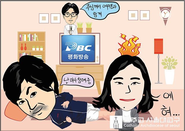 “자기야, 잘 봐. 성당에 가도 늦게 온 사람들을 위해서 소강당에 티비로 중계를 해주잖아. 평화방송에서도 주일에 미사 생중계를 해준다구. 소강당에서 티비로 주임신부님 미사를 보나, 집에서 티비로 다른 주임신부님 미사를 보는 거나 신부님만 다를 뿐 똑같잖아. 거룩한 마음으로 집에서 집중해서 보면 돼.”