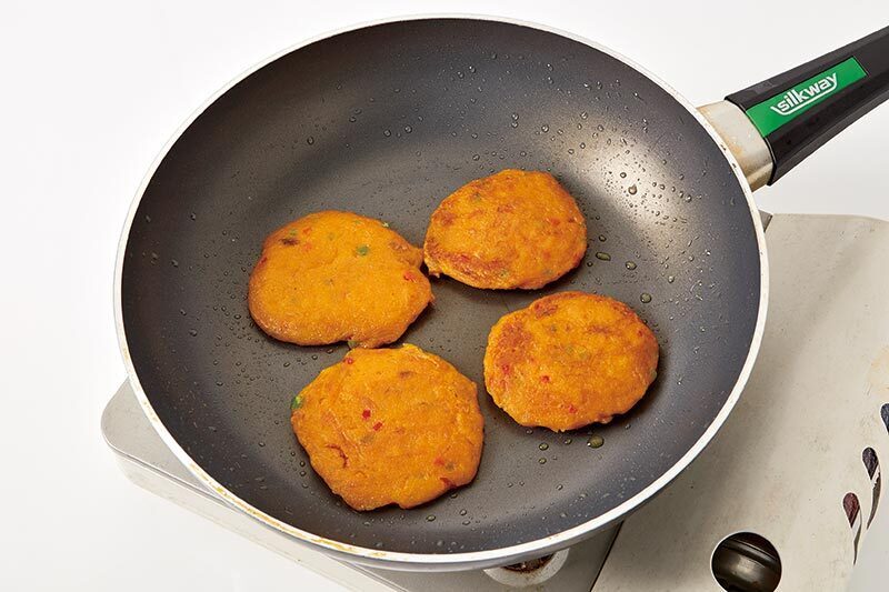 중간 불로 달군 팬에 식용유(2)를 둘러 반죽을 동그랗게 올리고,