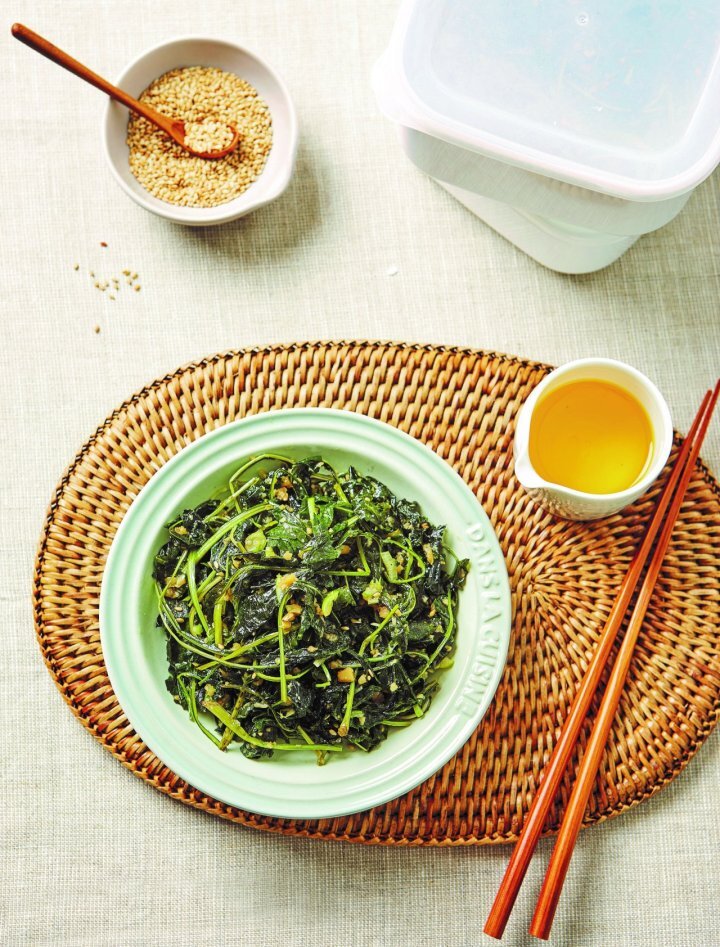 2. 물기를 꼭 잔 취나물은 국간장(6), 다진 마늘(4), 들기름(6), 참기름(2)을 넣어 조물조물 무치고,