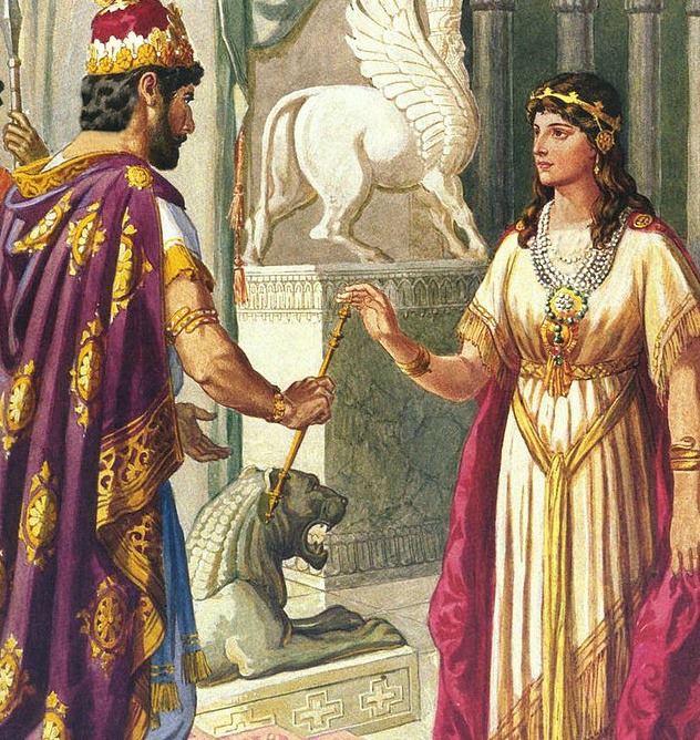 모로도카이는 수사 성에 살고 있는 모든 유다인들에게 사흘 동안 금식하며 기도하자고 했고 에스테르도 시녀들과 함께 기도와 금식을 지내고 정장을 차려입고 왕에게 나간다. 간절한 기도의 힘은 그를 결연한 용기로 허락 없이 왕의 면전에 다가간 것이다. 또한 하느님께서 임금의 영을 부드럽게 바꾸어 놓으셨기에 임금 앞에서 실신하여 쓰러지는 왕비를 향하여 벌떡 자리에서 일어나 왕비가 정신을 차릴 때까지 그를 팔에 안았고 다정한 말로 위로하며 안심하라고 한 뒤 무슨 일이 있어 왔는지 말하라고 한다. 왕비가 정신을 차리자 임금은 말한다. "다가오시오. 말한 뒤 황금 왕홀을 들어 에스테르의 목에 댄 다음 그를 껴안아 입을 맞춘 다음 "나에게 말해보오" 하며 말한다. 이 순간 에스테르는 마음속으로 하느님 감사합니다. 당신의 놀라운 섭리로 저는 살았고 우리 민족은 구원의 희망이 보입니다. 하고 상상했을 것 같다. 하지만 아직 때가 아니다. 임금이 무슨 일인가? 하고 궁금해하며 -