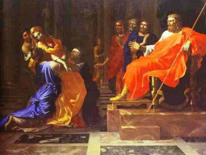 1(7) 그가 영광으로 빛나는 얼굴을 들고 지극히 노여운 눈으로 쳐다보자, 왕비는 실신하여 쓰러지면서 창백한 얼굴로, 앞서 가는 시녀의 머리에 몸을 기대었다.