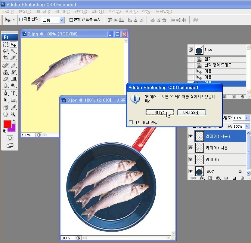 12. 레이어를 삭제하시겠습니까? 라는 메시지가 뜨며 확인버튼을 클릭합니다.