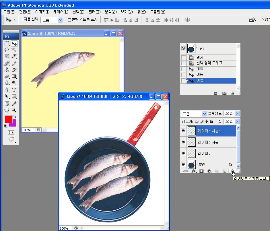 11. 다음은 생성된 레이어를 삭제하는 방법입니다. 레이어 팔레트에서 삭제항목을 클릭합니다.