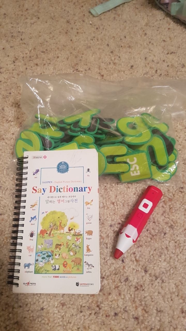 한국에서 쓰던 레인보우펜과 말하는 영어사전, 말하는 알파벳자석인데요. 유아들이 쓰기좋아요. 저 알파벳글자읽듯이 사전도 단어 다 읽어줘요. 한국에선 10만원이 훌쩍 넘는 제품들이에요.