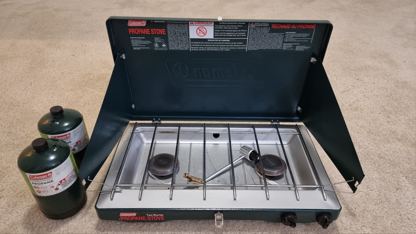 (판매완료) 2. Coleman propane stove(2구): 여행다니면서 picnic area에서 즐겨 사용했습니다. 바람을 막는 형태라 유용합니다.