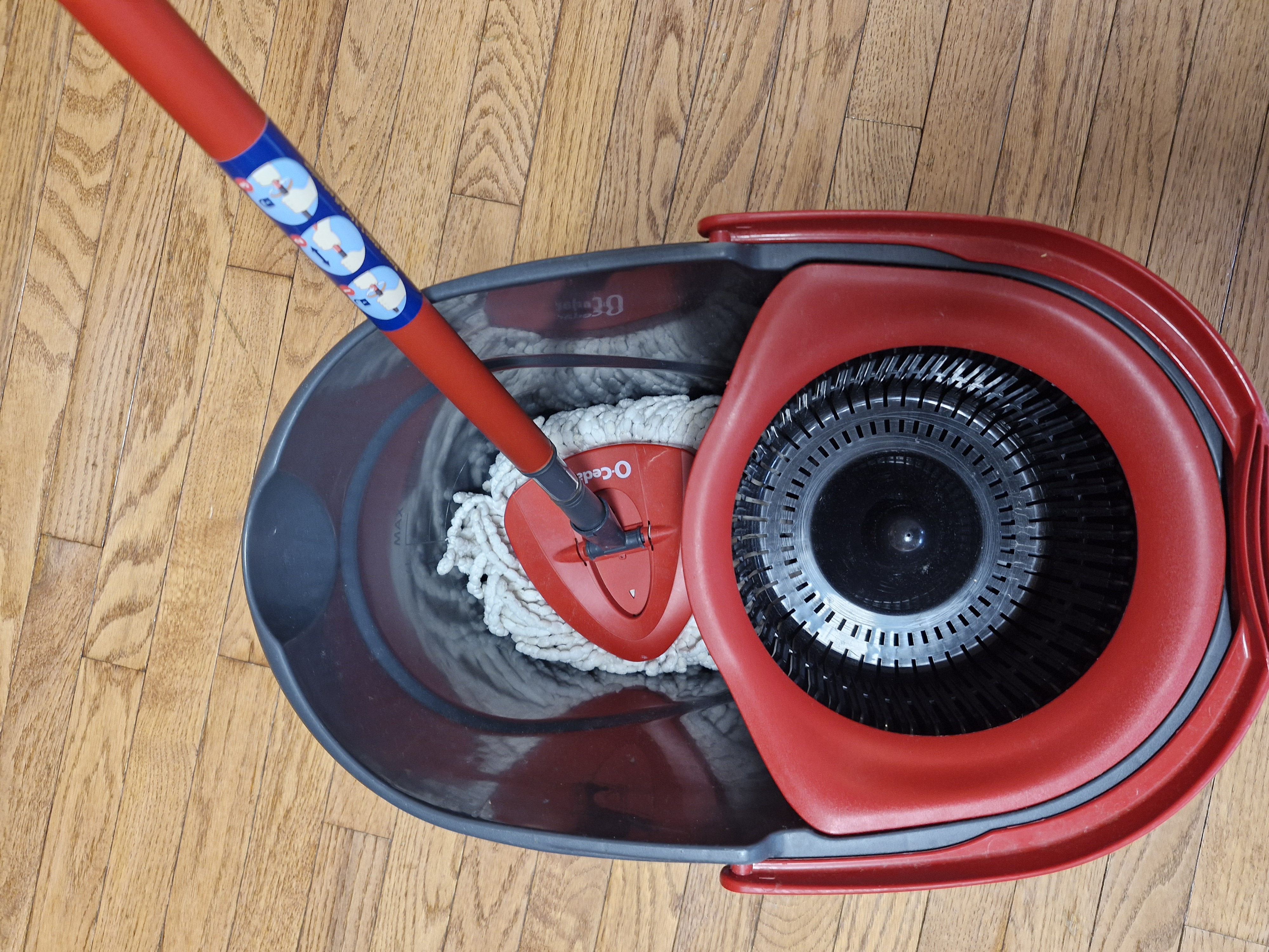 발로 밟아 물기를 짤 수 있어서 편해요. 손잡이 길이 조절 가능합니다. 깨끗하게 씻어두었습니다.