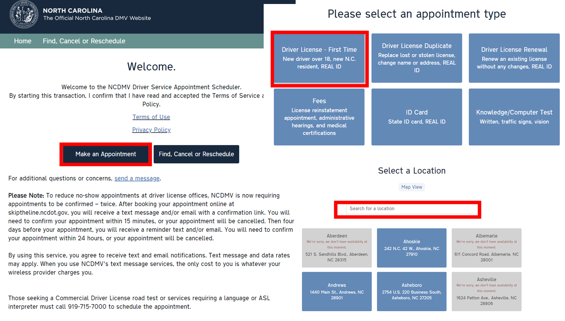https://skiptheline.ncdot.gov/Webapp/Appointment/Index/a7ade79b-996d-4971-8766-97feb75254de 여기 접속해서 예약 했고, 한국 IP로는 접속이 안되어 VPN 을 사용했던 것 같습니다. 예약은 3개월 후의 예약날짜가 열리고 select a location 에서 주소지를 치면 아래에 거리순으로 DMV 지점들이 정렬되어서 그중에서 가능하고, 가까운 곳을 예약하면 됩니다.