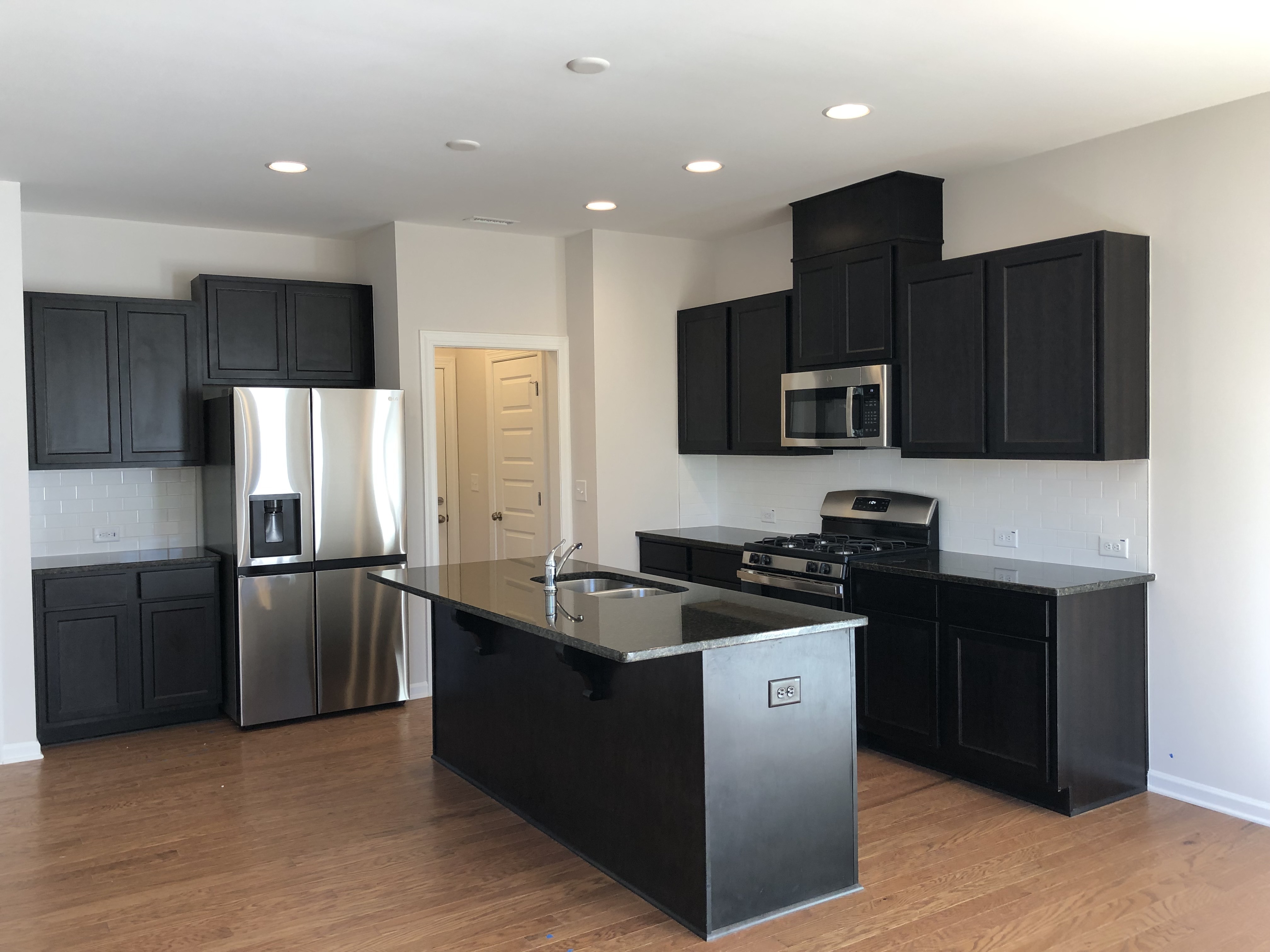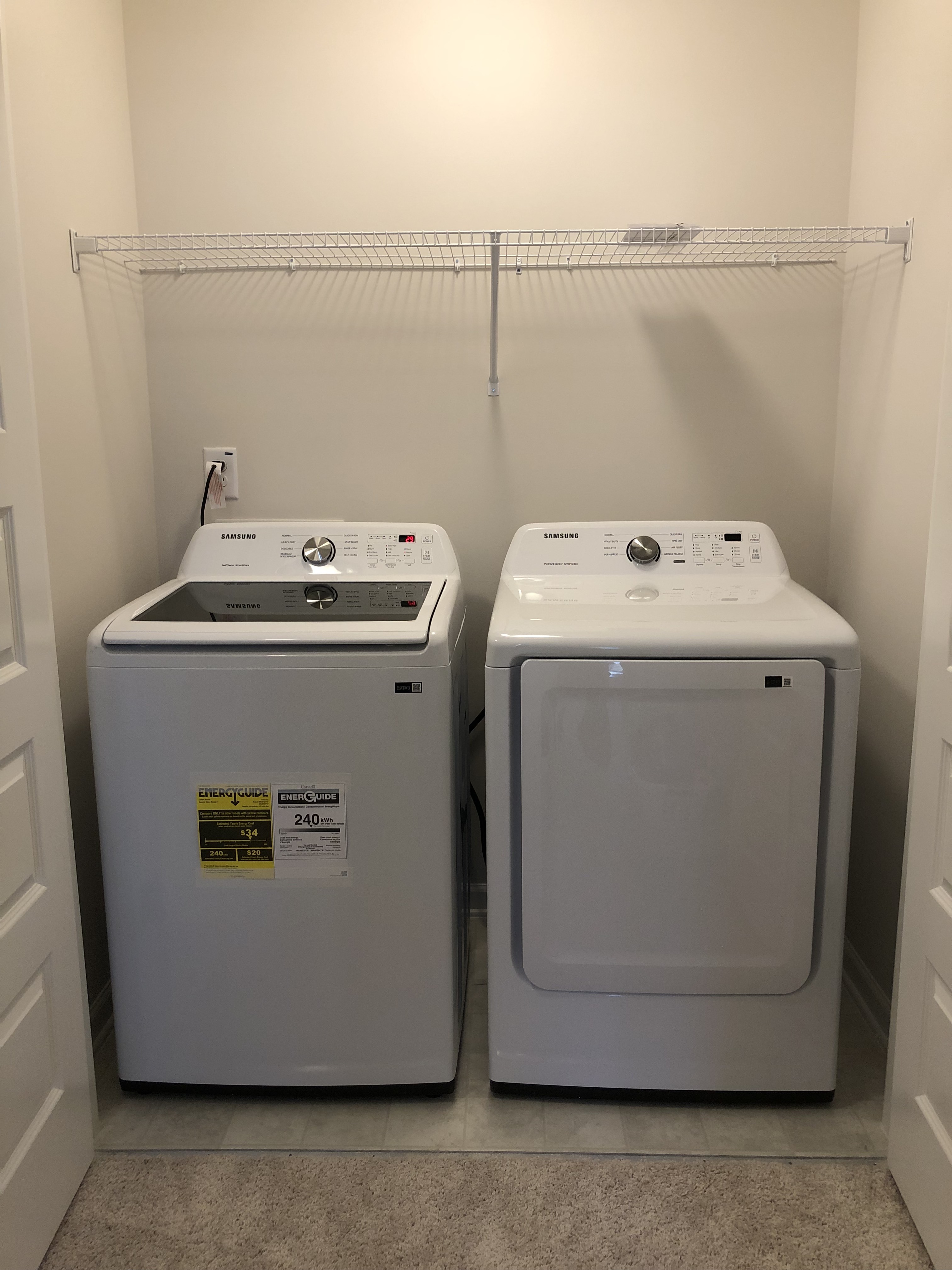LG 양문형 냉장고, 전자레인지, 오븐, 가스레인지, 식기 세척기, 음식물 분쇄기, 삼성 세탁기 & 건조기가 설치되어 있습니다.