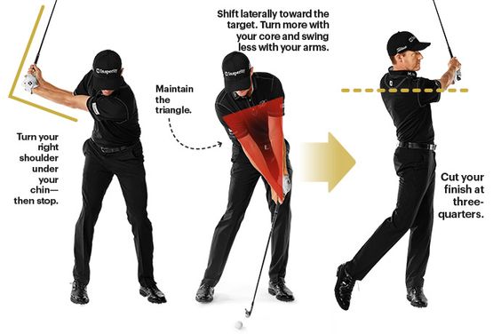 왼팔을 모두 펴고 스윙을 할 수 있는 선수는 한명도 없다. 타이거 우즈도 미세하게 굽은 왼팔을 가지고있다. 아마추어가 왼팔을 완벽하게 피려고하면 필연적으로 몸이 굳어지는 나쁜동작이 생긴다. 레슨받을때 레슨프로가 왼팔을 펴라 강조 한다면 학생의 왼팔이 필요 이상으로 구부리며 백스윙 하기에 그런 주문을 할것이다.백스윙에서 왼손을 조금 구부려도 전혀 문제가없고 어떤 경우에는 더 유리하기도 한다. 반대로 다운스윙에서는 왼손을 모두 펴야 한다.
