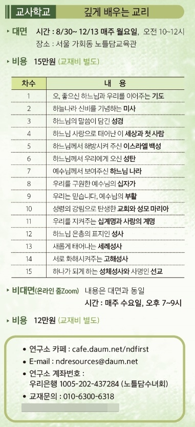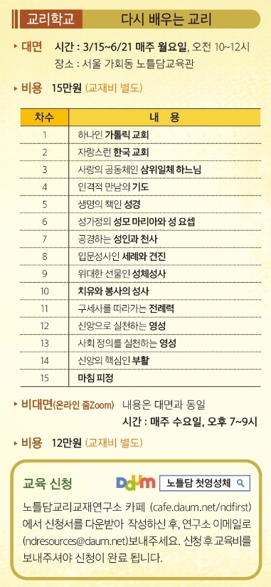 | 교육 | ▸ 대면 교육 · 시간: 3/15~6/21 매주 월요일 / 오전 10~12시 · 장소: 서울 가회동 노틀담 교육관 · 비용: 15만원(교재비 별도) ▸ 비대면 교육(온라인 ZOOM) · 시간: 3/17~6/23 매주 수요일 / 오후 7시~9시 · 비용: 12만원(교재비 별도) | ▸ 대면 교육 · 시간: 8/30~12/13 매주 월요일 / 오전 10~12시 · 장소: 서울 가회동 노틀담 교육관 · 비용: 15만원(교재비 별도) ▸ 비대면 교육(온라인 ZOOM) · 시간: 9/1~12/15 매주 수요일 / 오후 7시~9시 · 비용: 12만원(교재비 별도) |
