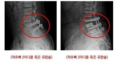 척추유합술은 척추뼈 2~3마디에 나사를 박아 고정시키는 수술입니다. 수술 시에 이미 근육과 인대 뿐 아니라