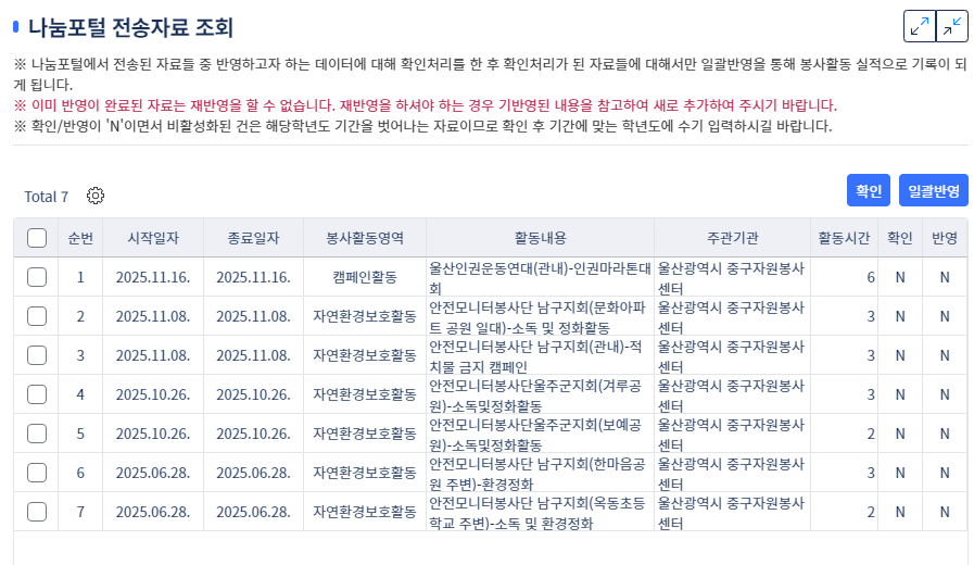 봉사활동 실적 입력과 관련하여 문의드립니다.