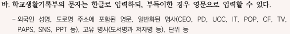 영문 사용이 부득이한 경우: 외국인 성명, 도로명 주소에 포함된 영문, 일반화된 명사(CEO, PD, UCC, IT, POP, CF, TV, PAPS, SNS, PPT 등), 고유명사(도서명과 저자명 등), 단위 등 -