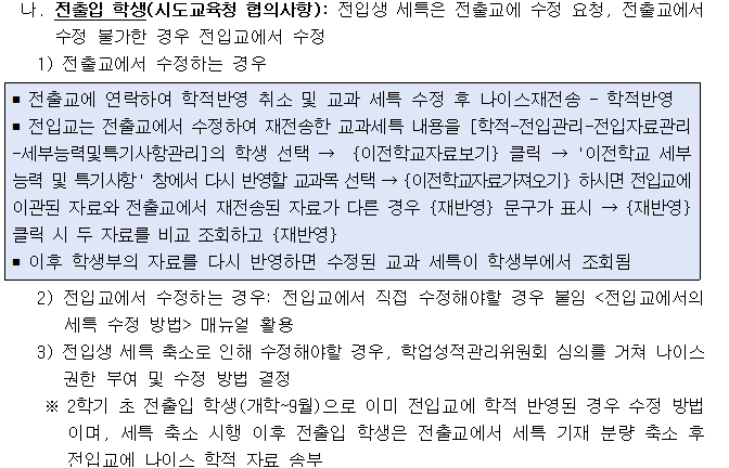 다만, 사진의 첫줄(나.~)에 언급되었듯이 ① 전출교 수정 후 재전송이 가장 원칙적이고 권장되는 방법입니다.