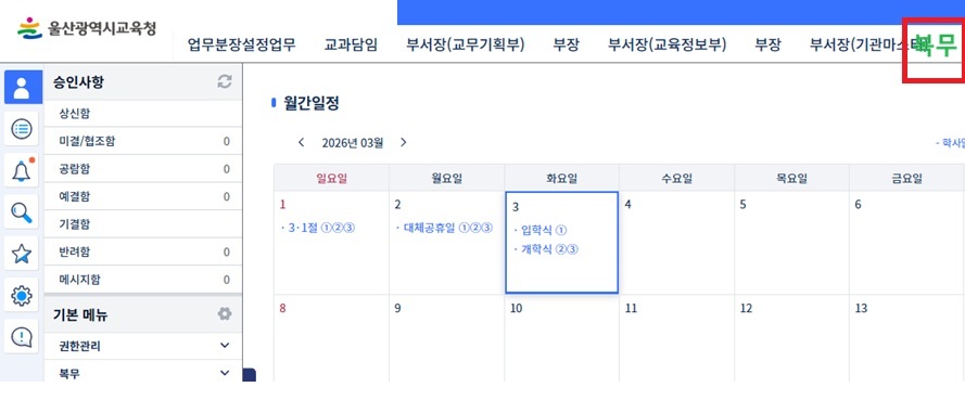 저희 학교 교감 선생님이 나이스 접속시 상단에 '복무'라는 업무 탭을 만들어 달라고 하던데요. (하단 그림 참조)