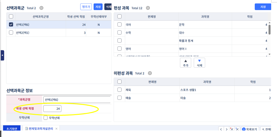 문의하신, "학생선택학점"에는 해당 선택군의 총 학점인 "24학점"을 넣으시면 됩니다. 왼쪽 "학생선택학점"이 총 24학점이고, 해당 그룹에 포함된 오른쪽 위 과목(문학, 대수, 확통, 영어1 등)이 각 4학점이므로 시스템에서 자동으로 6개 과목 선택임을 인식합니다. -
