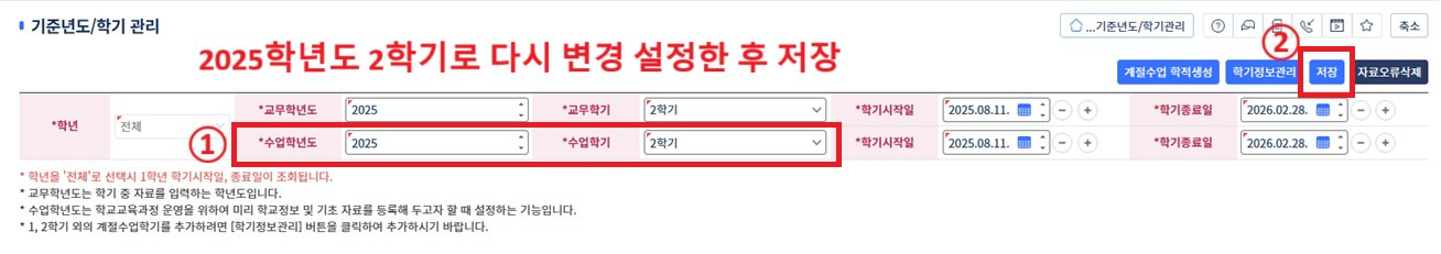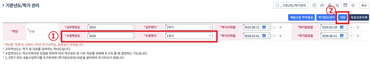 수업학년도:2026, 수업학기:1학기로 저장(날짜는 수정하지 않음.)