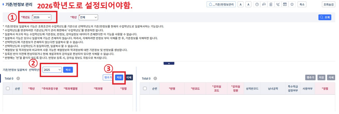 기준/반정보 일괄복사: 선택학년도 2025로 선택한 후, 복사하고 저장함.