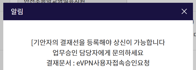 기안자의 결재선을 등록해야 상신이 가능합니다. 작성자렛츠고힛|작성시간24.03.27|조회수639 목록 댓글 3 글자크기 작게가 글자크기 크게가 출산 휴가중이신 공무직이시고 육아휴직을 사용하시결고 집에서 evpn을 신청하려고 합니다. 아래메세지가 뜨는데 무엇때문일까요? 다음검색 현재 게시글 추가 기능 열기 북마크 공유하기 신고 센터로 신고 댓글 댓글 3 댓글쓰기 답글쓰기 댓글 리스트 작성자김지영(NEIS자문단) | 작성시간 24.03.29 안녕하세요, 선생님.원격업무 담당자가 [{업무승인관리} 업무승인 - 결재경로관리 - 결재선관리]에서 결재선 및 적용 대상자를 사전에 등록해야 합니다. 결재선과 적용 대상자를 미등록 시에는 외부에서 신청이 불가능합니다. 아래 그림을 참고하시기 바랍니다. 작성자김지영(NEIS자문단) | 작성시간 24.03.29 이미지 확대 답댓글 작성자렛츠고힛 작성자 본인 여부 작성자 | 작성시간 24.03.29 감사합니다.^^ 댓글 전체보기