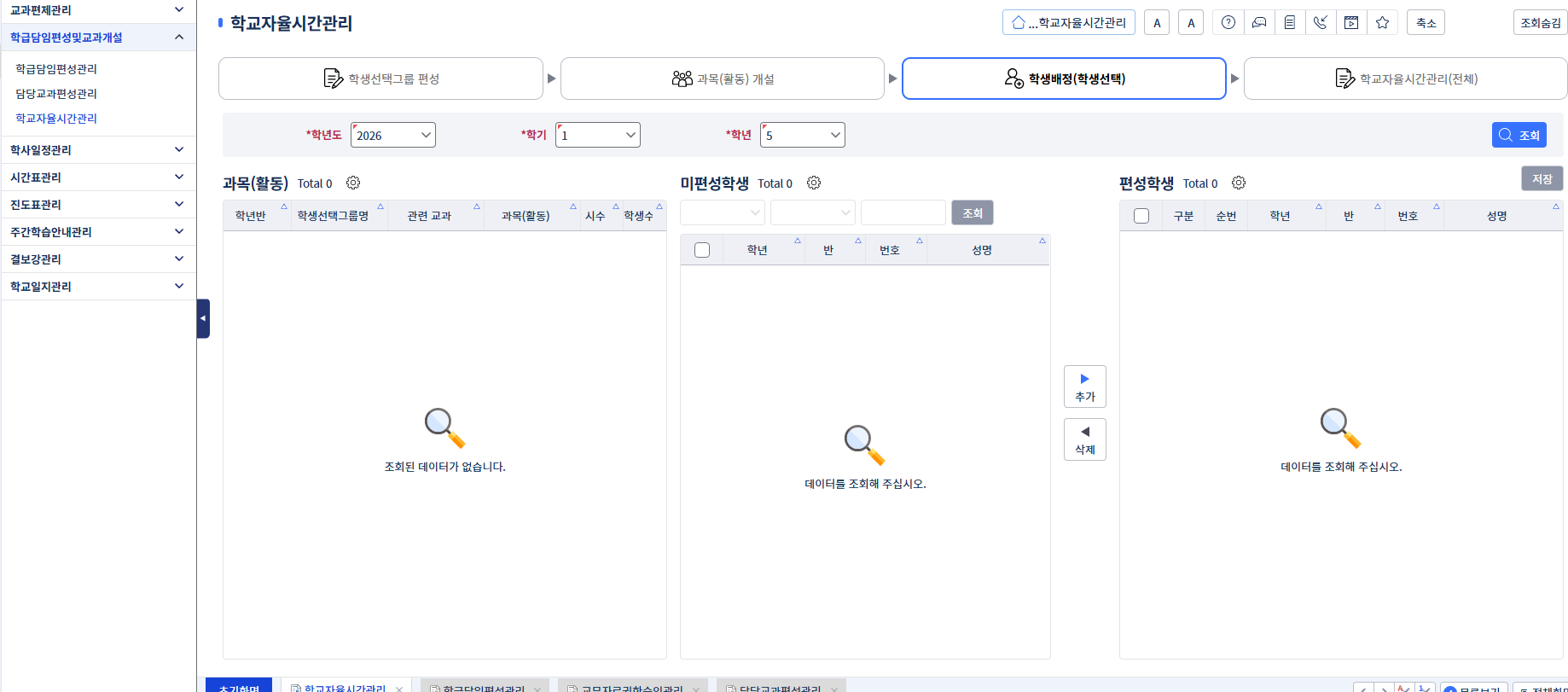 그 후 다음 단계인 학생배정에서 학생명단이나 다른게 뜨지 않습니다