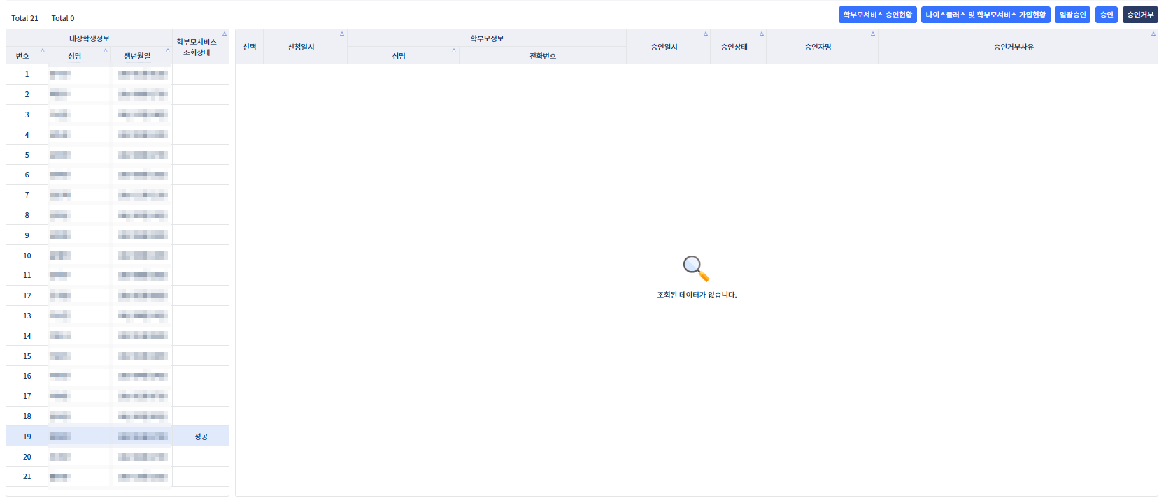 안녕하세요 학부모서비스승인관리에서 19번 학생이 학부모서비스 조회 상태에서 성공은 뜨는데 신청일시나 학부모정보 등이 아예 뜨지 않습니다. 학부모님은 나이스학부모서비스를 가입했다고 하시는 상황입니다. 어떤 것이 문제라서 뜨지 않고 있는가요?