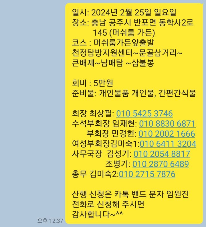 2024년 2월 늘솔길산악회 정기트레킹 및 시산제 작성자김미숙투|작성시간24.02.16|조회수385 목록 댓글 0 글자크기 작게가 글자크기 크게가 2024년 2월 늘솔길 산악회 트레킹 후 갑진년 안전산행과 무사귀환을 기도하는 시산제 충남 반포면 계룡산 다음검색 현재 게시글 추가 기능 열기 북마크 공유하기 신고 센터로 신고 댓글 댓글 0 댓글쓰기 답글쓰기 댓글 리스트