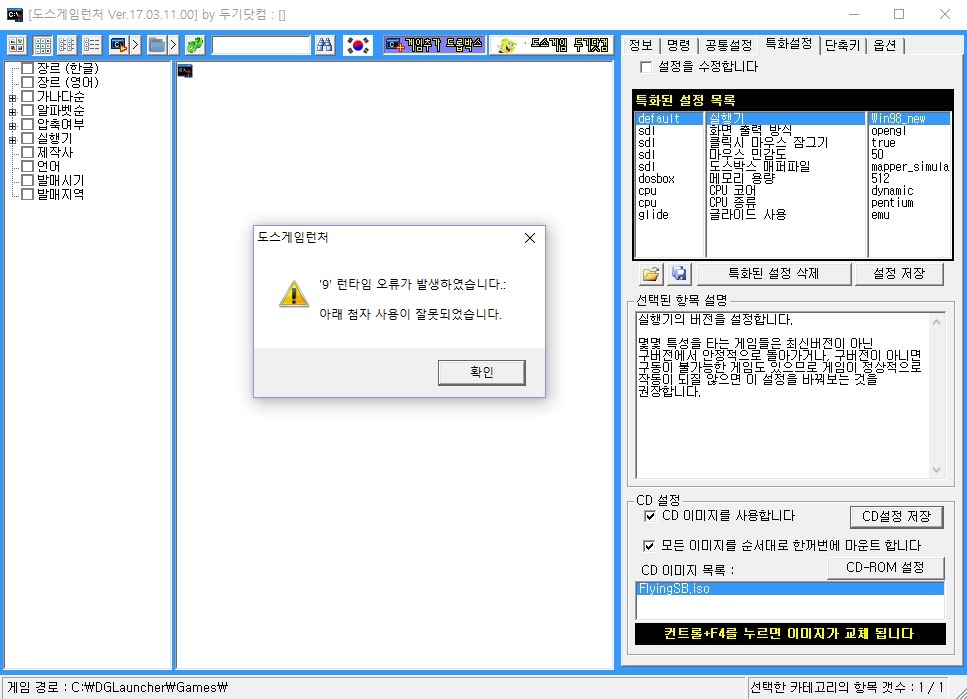 iso파일이 있어서 런처사용법에 있는 방식대로 해봤는데 저기서 CD설정 저장버튼을 클릭하면 저런 에러가 뜹니다