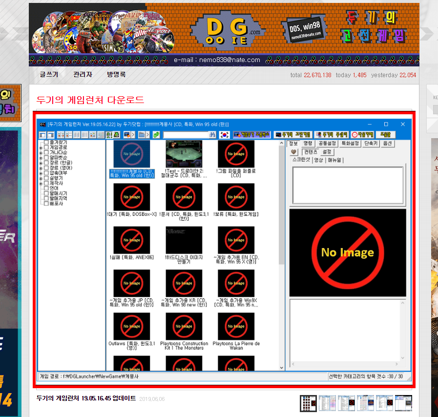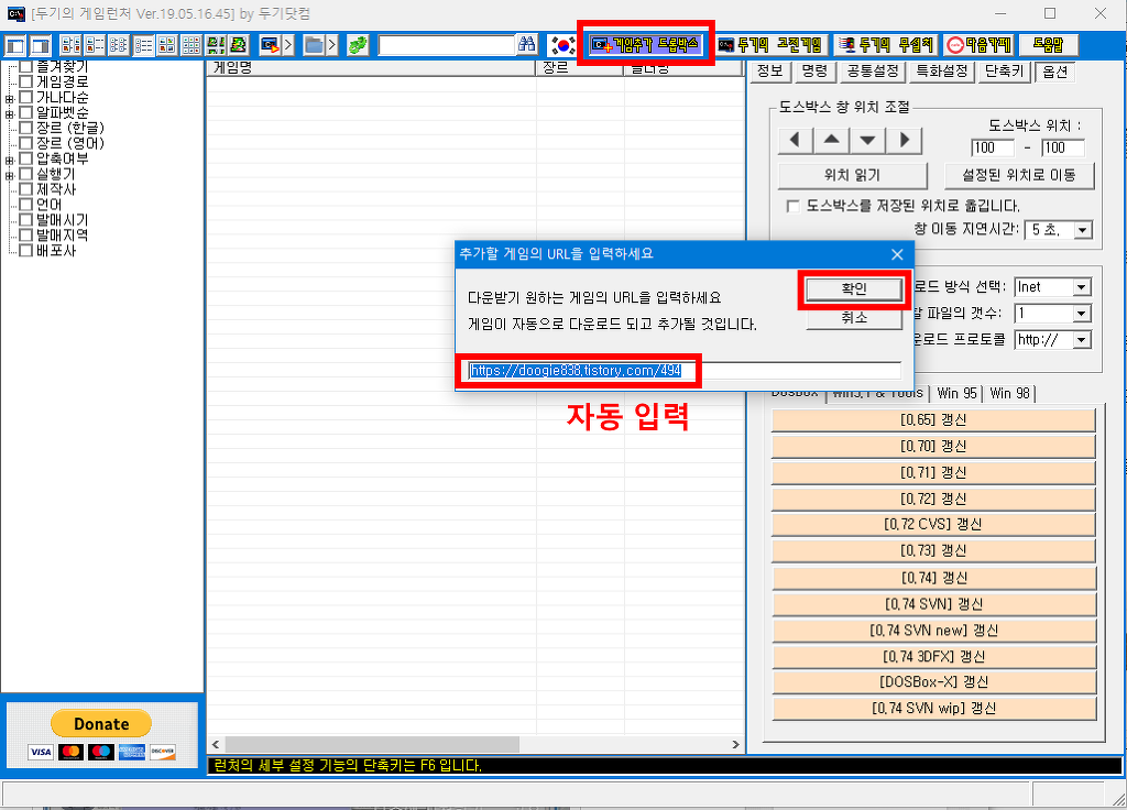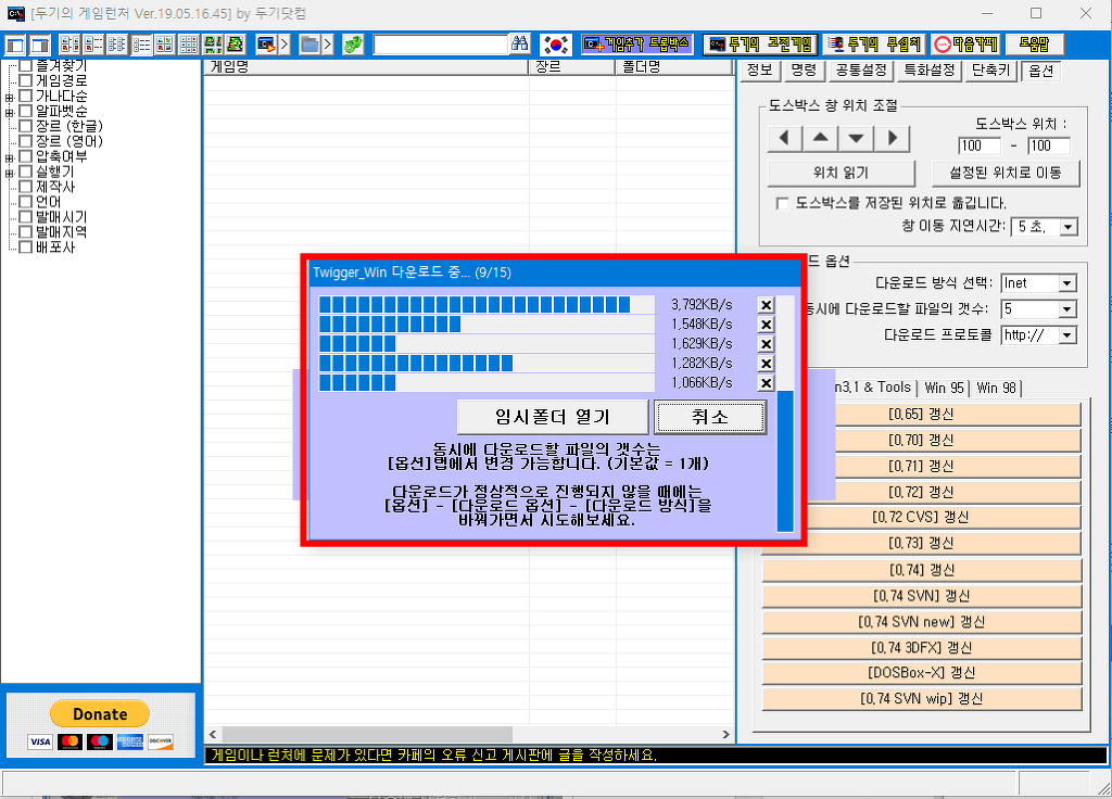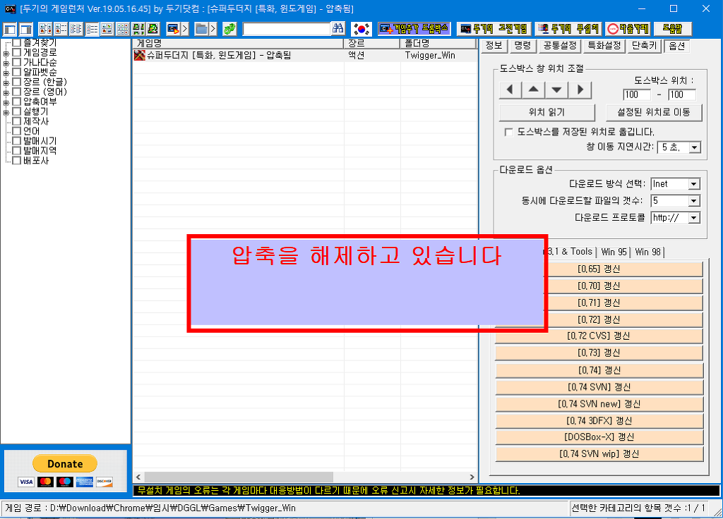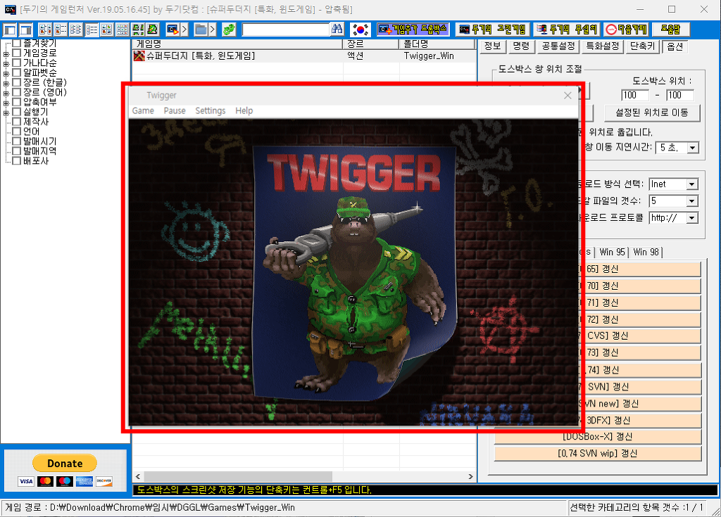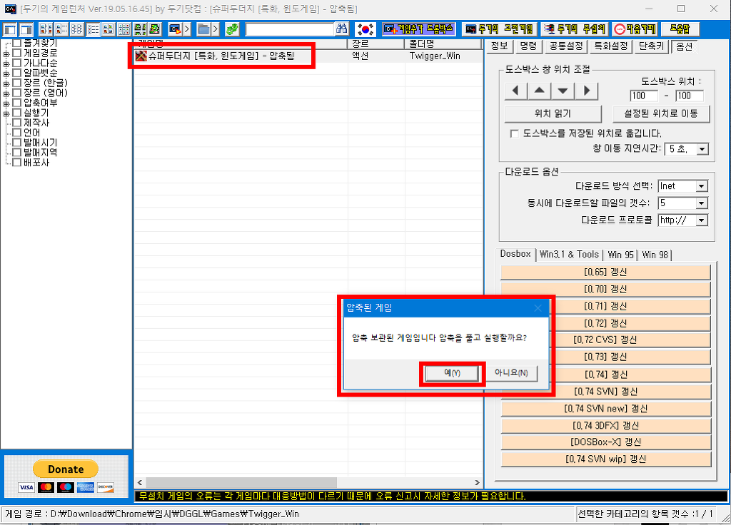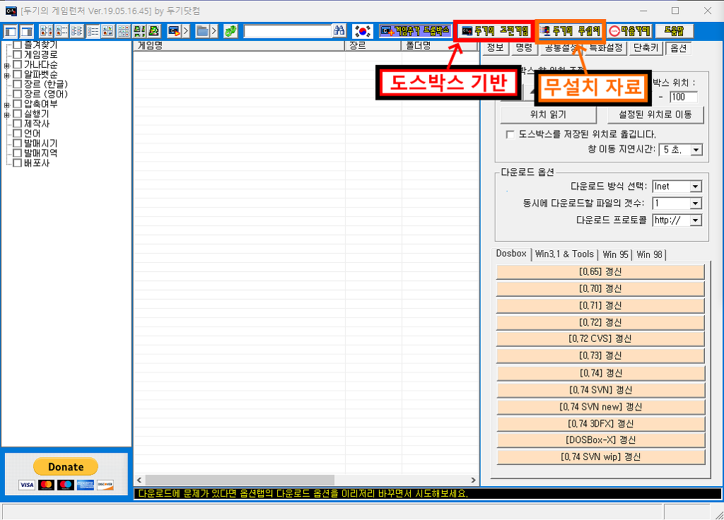 - 도스박스 기반으로 구동되는 게임을 다운받고자 한다면 '두기의 고전게임'버튼을