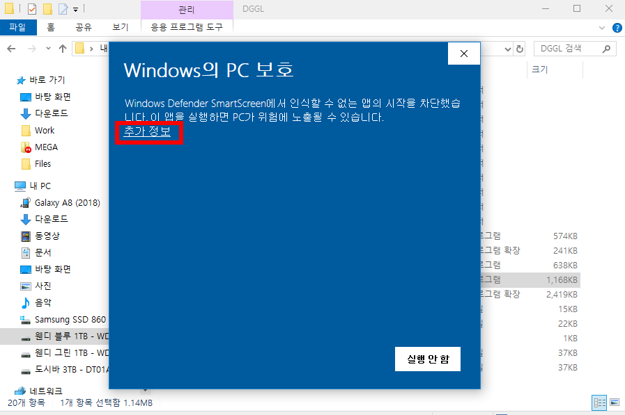 - 보안 관련 창이 뜬다면, '추가 정보'를 클릭해서 실행하면 된다.