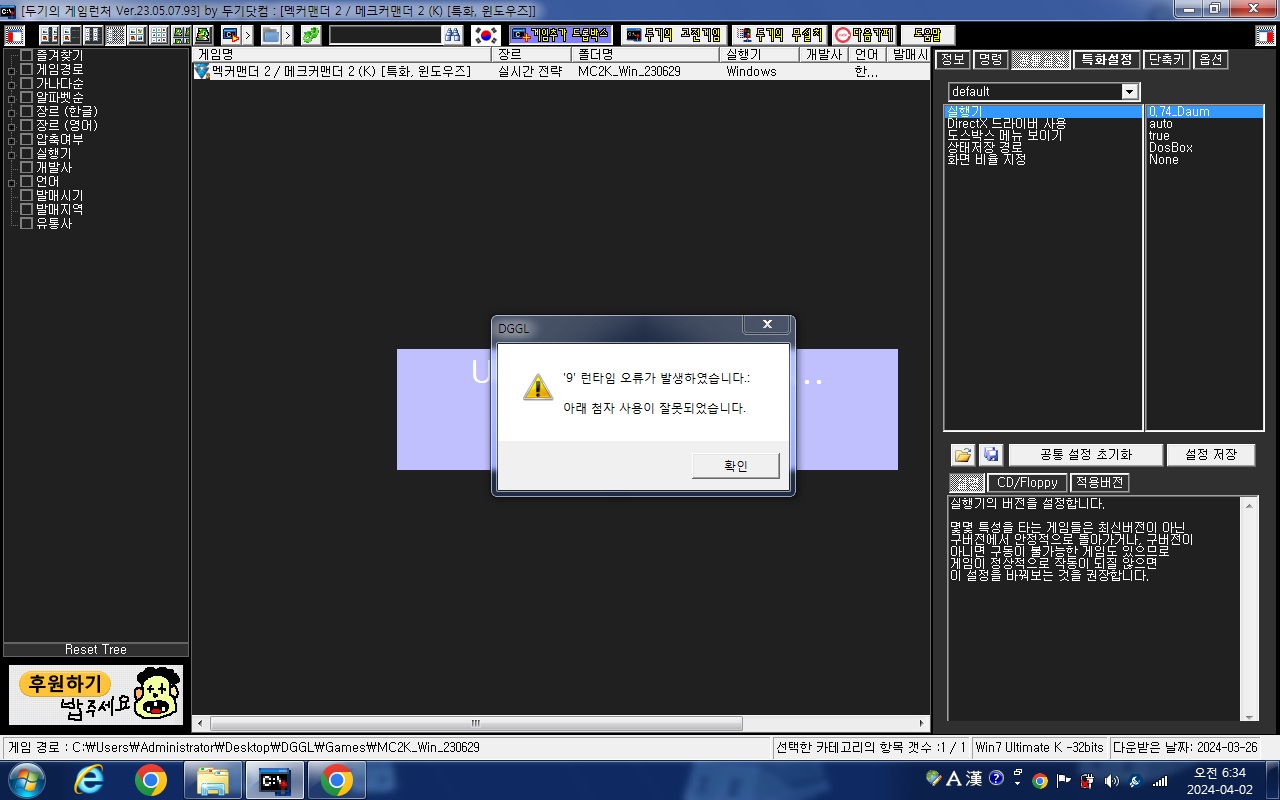오류 현상: 게임 실행 및 게임추가 드롭박스 사용시