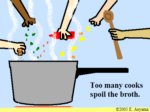 Too many cooks spoil the broth 너무 많은 요리사가 매우 쉬운 요리도 망친다-사공이 많으면 배가 산으로 간다