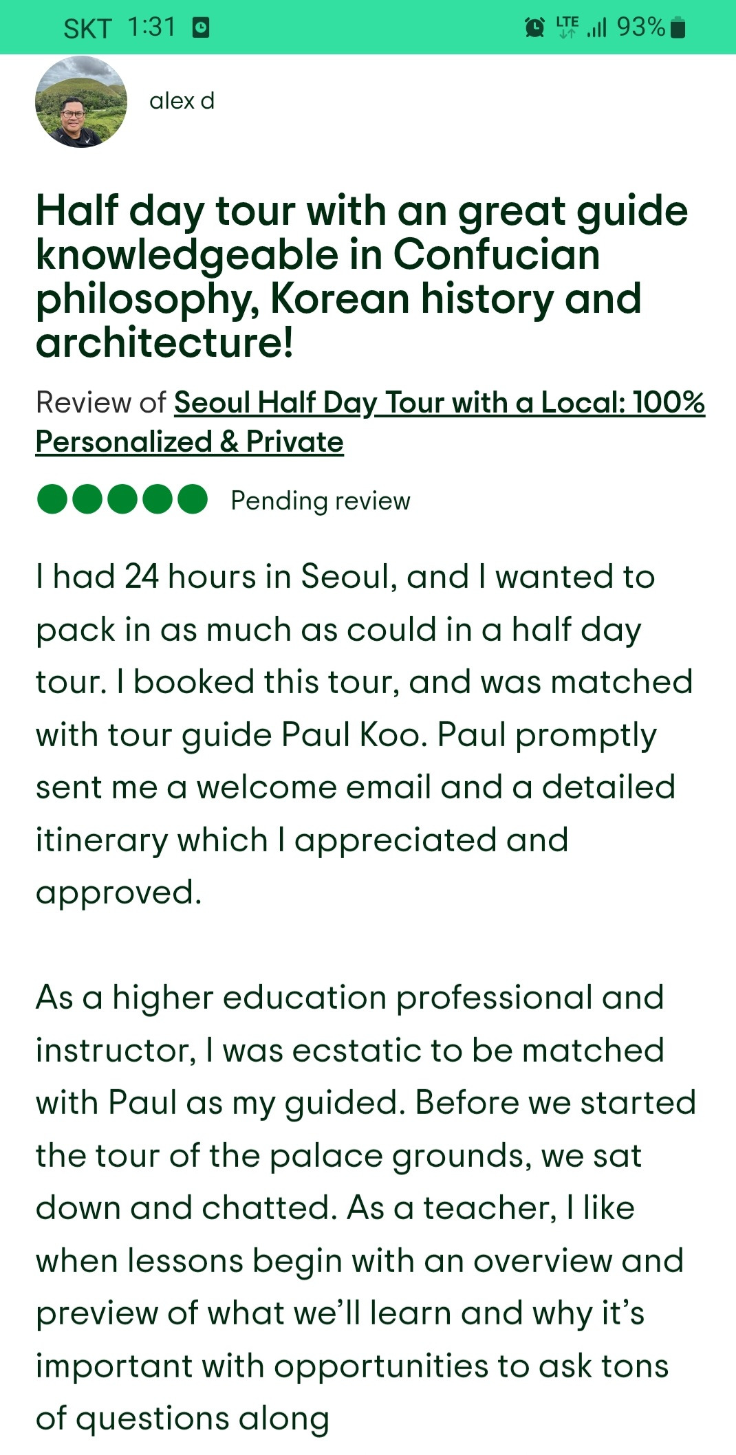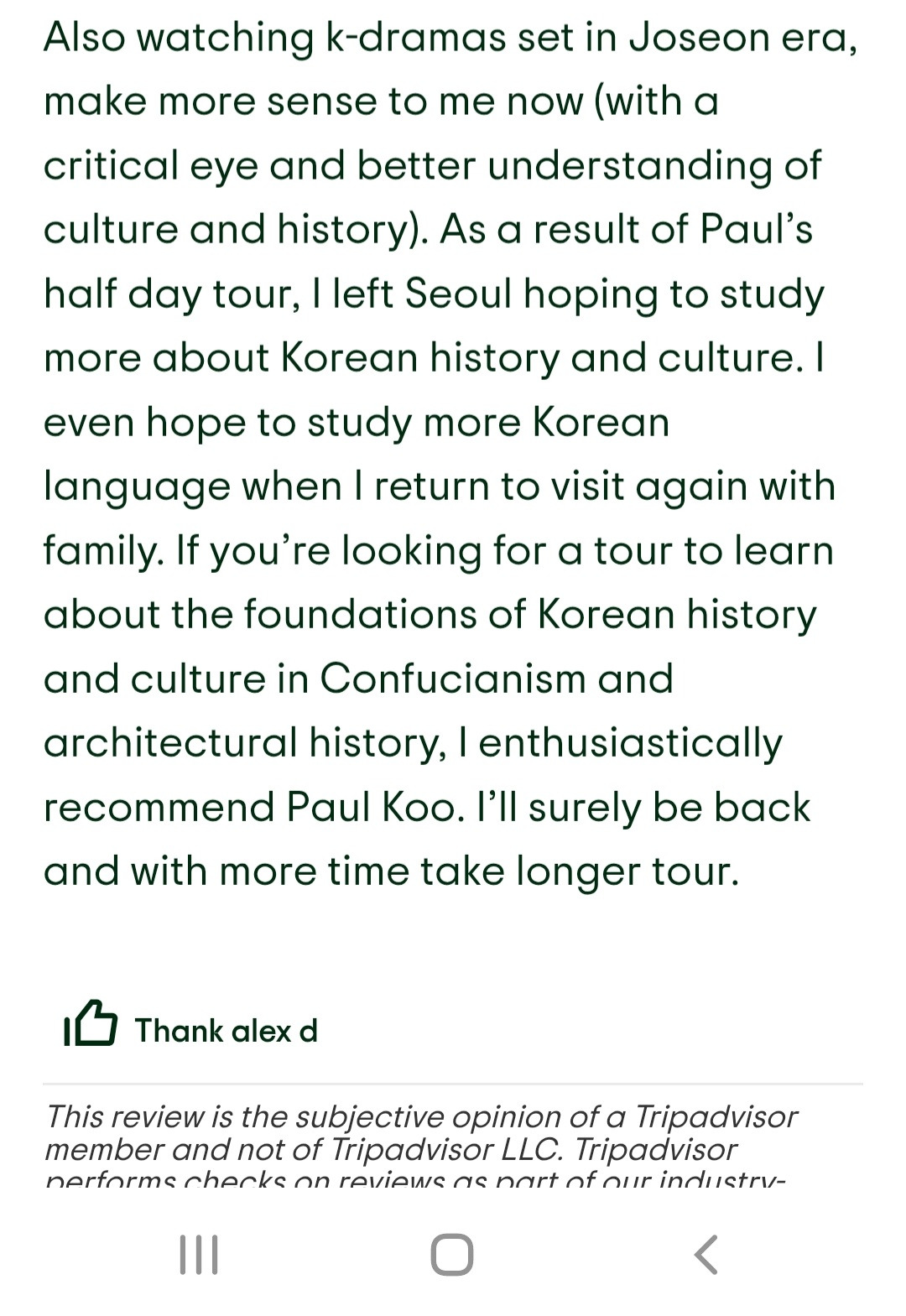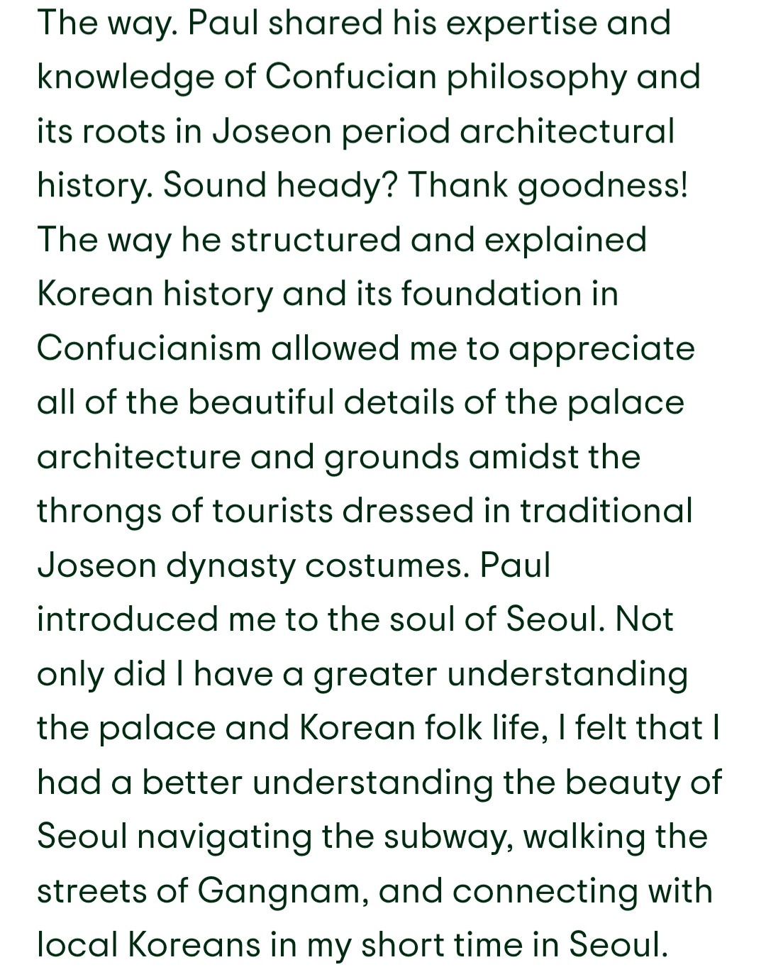 I felt that I had a better understanding the beauty of Seoul navigating the subway, walking the streets of Gangnam, and connecting with local Koreans in my short time in Seoul. Also watching k-dramas set in Joseon era, make more sense to me now (with a critical eye and better understanding of culture and history). As a result of Paul’s half day tour, I left Seoul hoping to study more about Korean history and culture. I even hope to study more Korean language when I return to visit again with family. If you’re looking for a tour to learn about the foundations of Korean history and culture in Confucianism and architectural history, I enthusiastically recommend Paul Koo. I’ll surely be back and with more time take longer tour.>