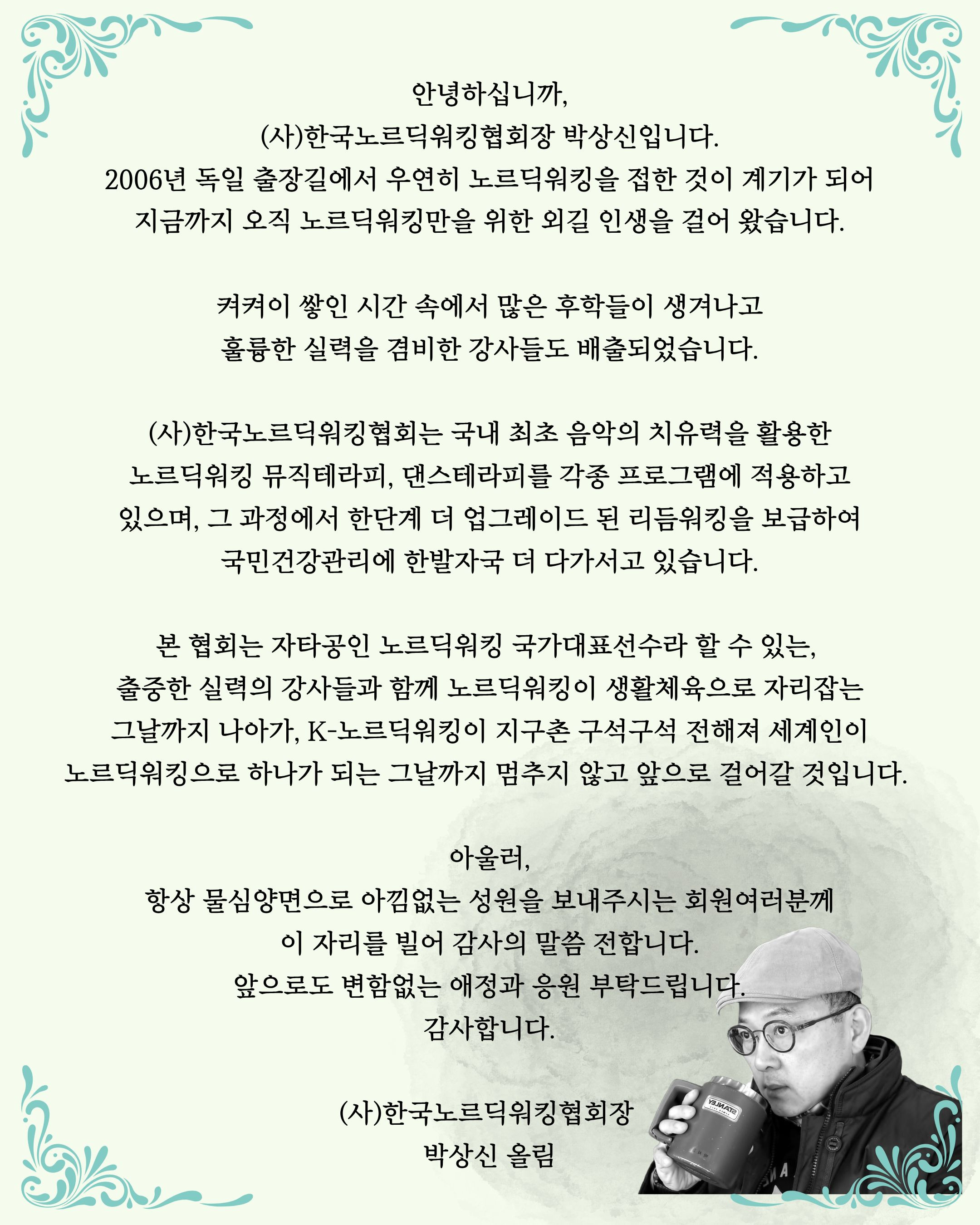 (사)한국노르딕워킹협회 박상신 협회장 인사말 작성자김세정[사무국장]|작성시간26.01.17|조회수21 목록 댓글 0 글자크기 작게가 글자크기 크게가 다음검색 현재 게시글 추가 기능 열기 북마크 공유하기 신고 센터로 신고 댓글 댓글 0 댓글쓰기 답글쓰기 댓글 리스트